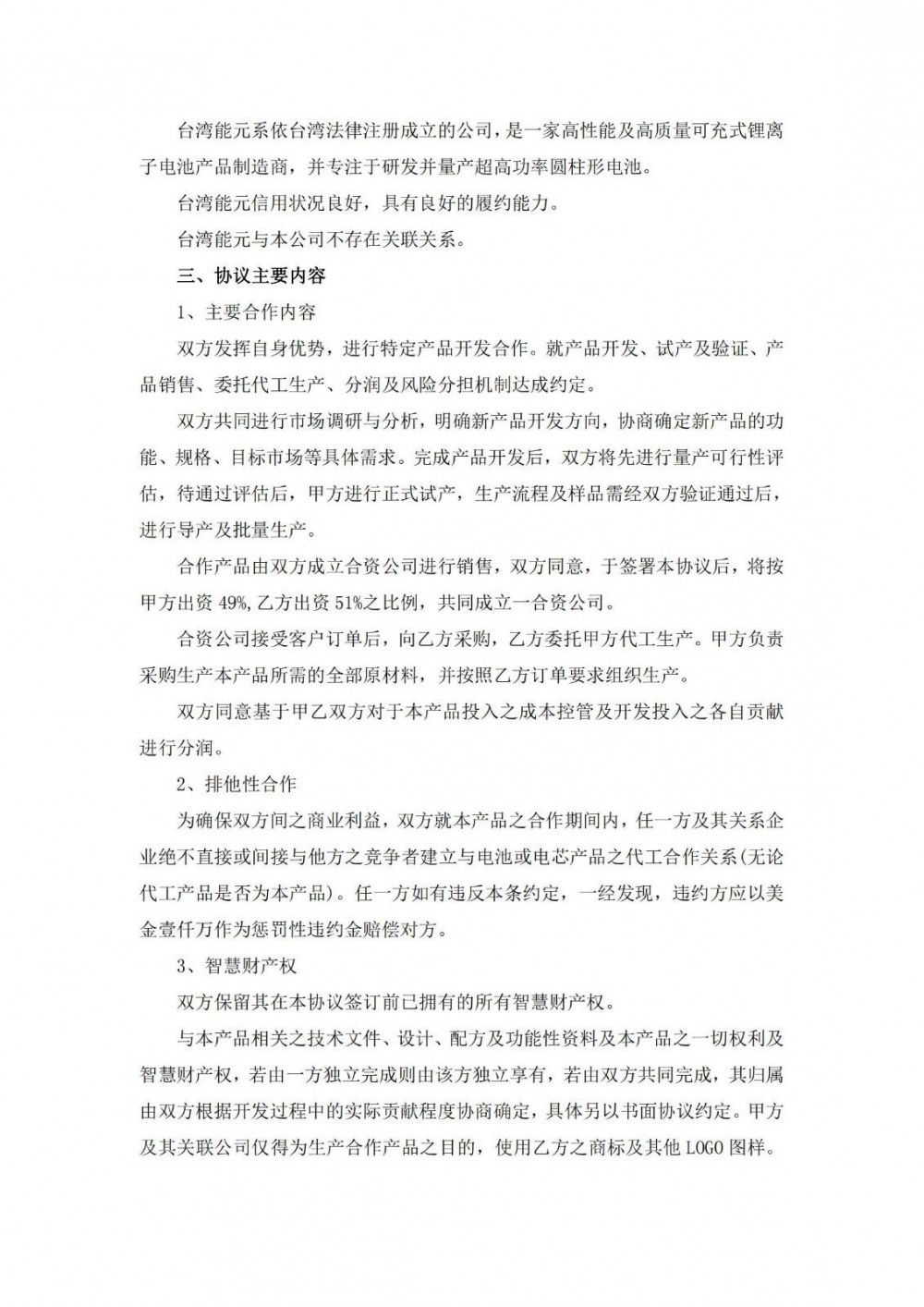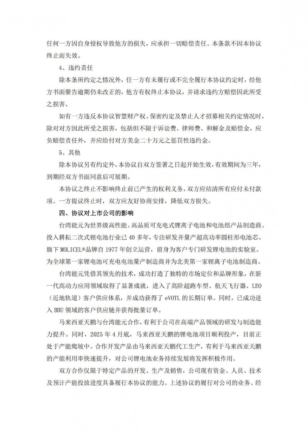 8月20日,蔚蓝锂芯发布公告称,公司全资子公司TenPower MalaYsia Sdn Bhd2025年8月19日与能元科技股份有限公司签署了《合作框架协议书》,双方发挥各自优势,进行特定产品开发合作、试产及验证、委托代工,并成立合资公司进行产品销售。本协议自双方签署之日起开始生效,有效期间为三年,到期经双方书面同意后可展期。