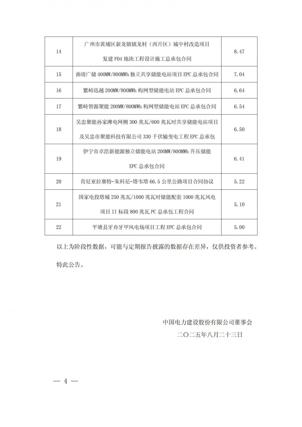 8月23日,中国电力建设股份有限公司披露2025年1月至7月主要经营情况公告。
