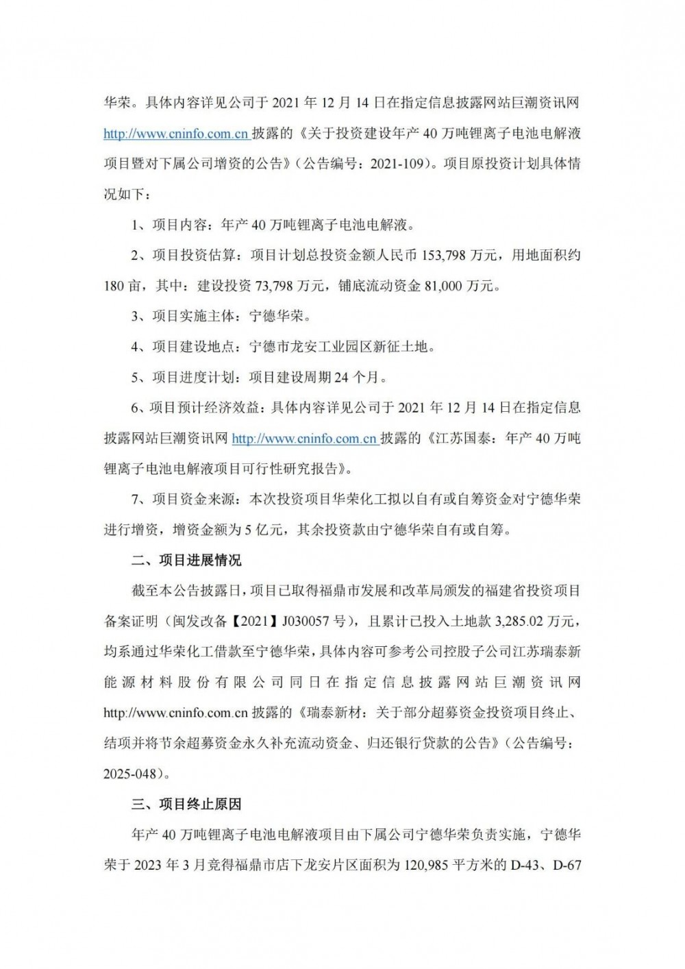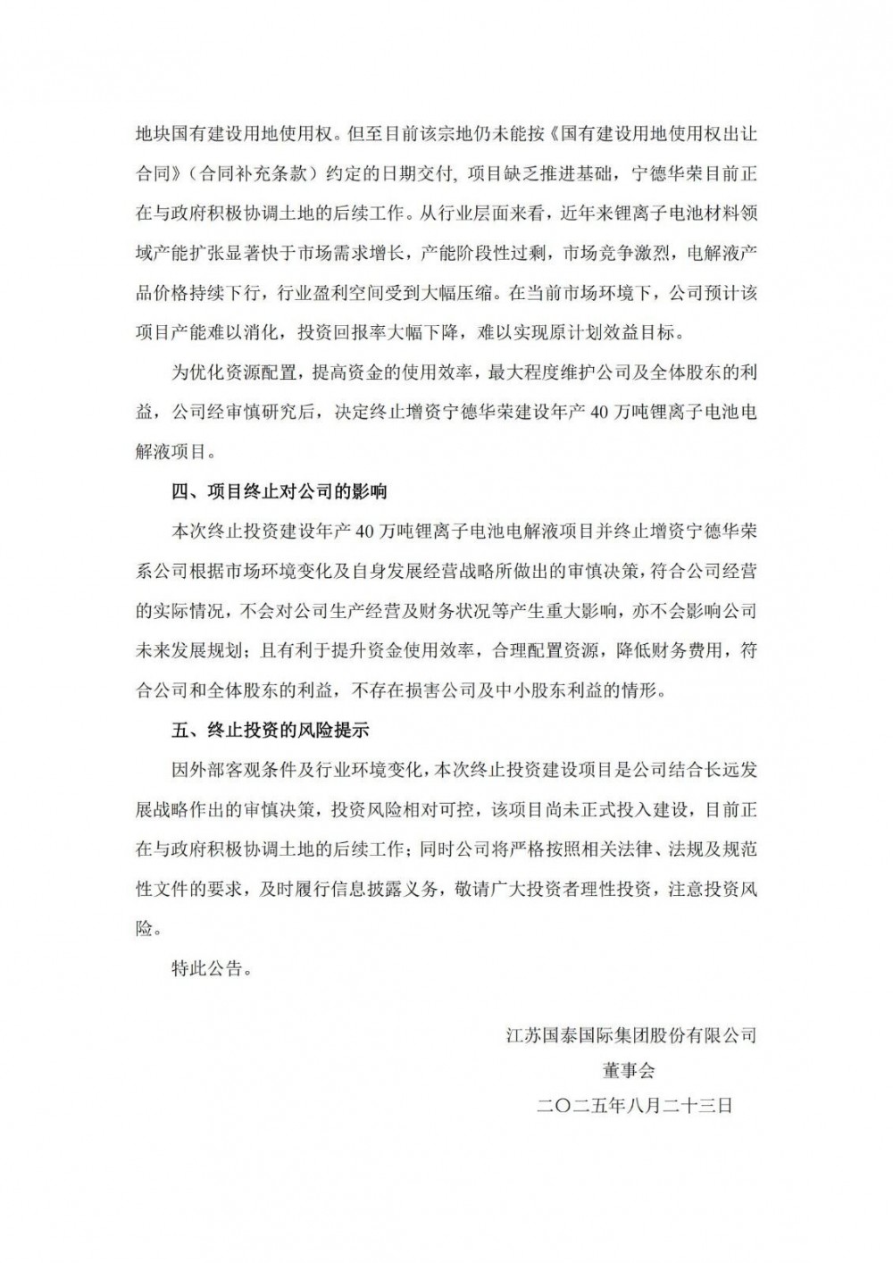 对于项目终止原因,江苏国泰表示,年产40万吨锂离子电池电解液项目由下属公司宁德华荣负责实施,宁德华荣于2023年3月竞得福鼎市店下龙安片区面积为120,985平方米的D-43、D-67地块国有建设用地使用权。但至目前该宗地仍未能按《国有建设用地使用权出让合同》(合同补充条款)约定的日期交付,项目缺乏推进基础,宁德华荣目前正在与政府积极协调土地的后续工作。从行业层面来看,近年来锂离子电池材料领域产能扩张显著快于市场需求增长,产能阶段性过剩,市场竞争激烈,电解液产品价格持续下行,行业盈利空间受到大幅压缩。在当前市场环境下,公司预计该项目产能难以消化,投资回报率大幅下降,难以实现原计划效益目标。