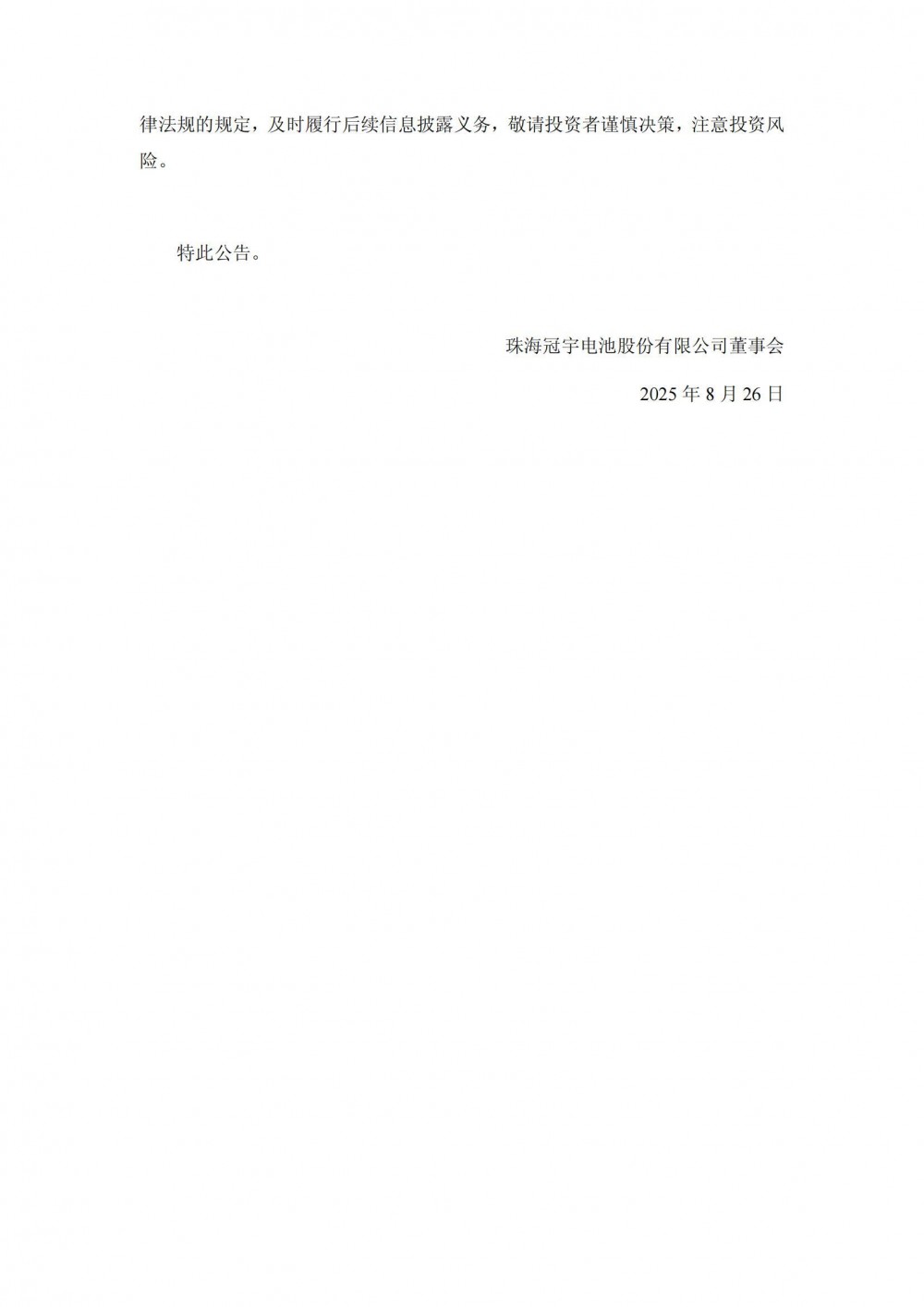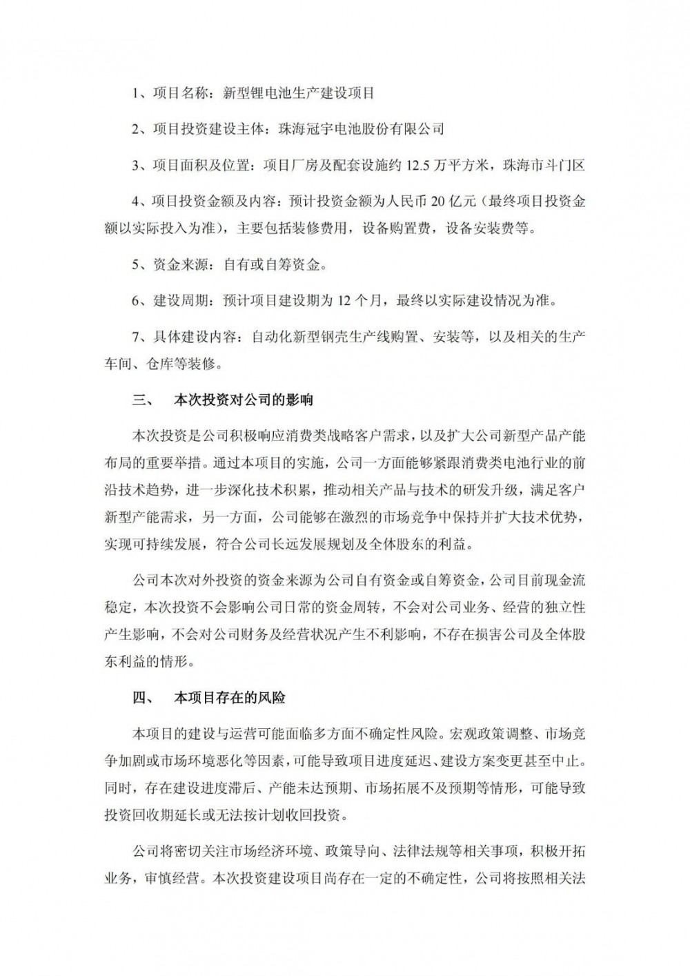 8月25日晚,珠海冠宇发布公告称,为提升公司产品核心竞争力,满足公司客户需求,巩固并扩大现有市场份额,公司拟以自有资金或自筹资金约人民币20亿元(最终项目投资金额以实际投入为准)利用已建厂房实施新型锂电池生产建设项目,投资建设新型钢壳量产线。