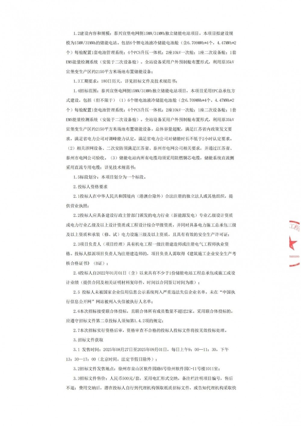 8月27日,泰兴宣堡电网侧15MW/31MWh独立储能电站项目工程总承包招标公告发布。