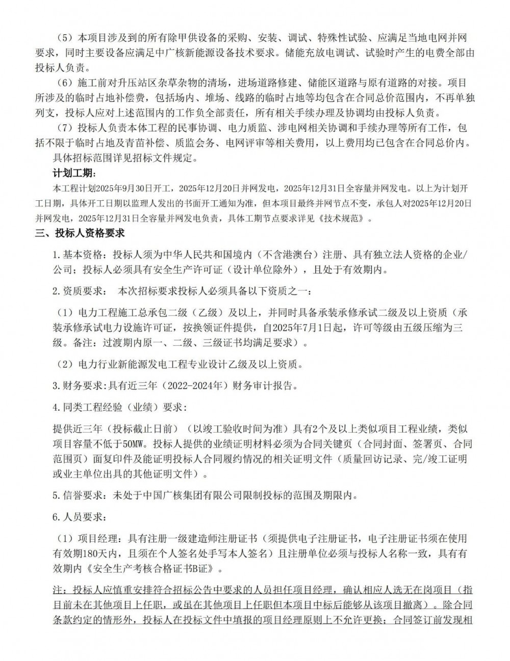 (5)本项目涉及到的所有除甲供设备的采购、安装、调试、特殊性试验、应满足当地电网并网要求,同时主要设备应满足中广核新能源设备技术要求。储能充放电调试、试验时产生的电费全部由投标人负责。