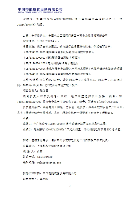 中国电力工程顾问集团中南电力设计院有限公司以51880.790064万元,折合单价0.6485元/Wh,位列第二中标候选人。