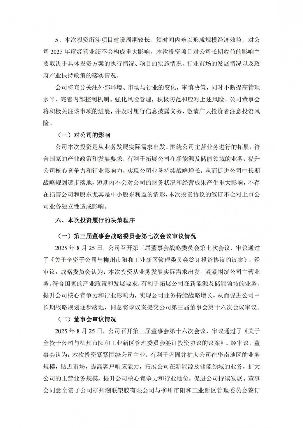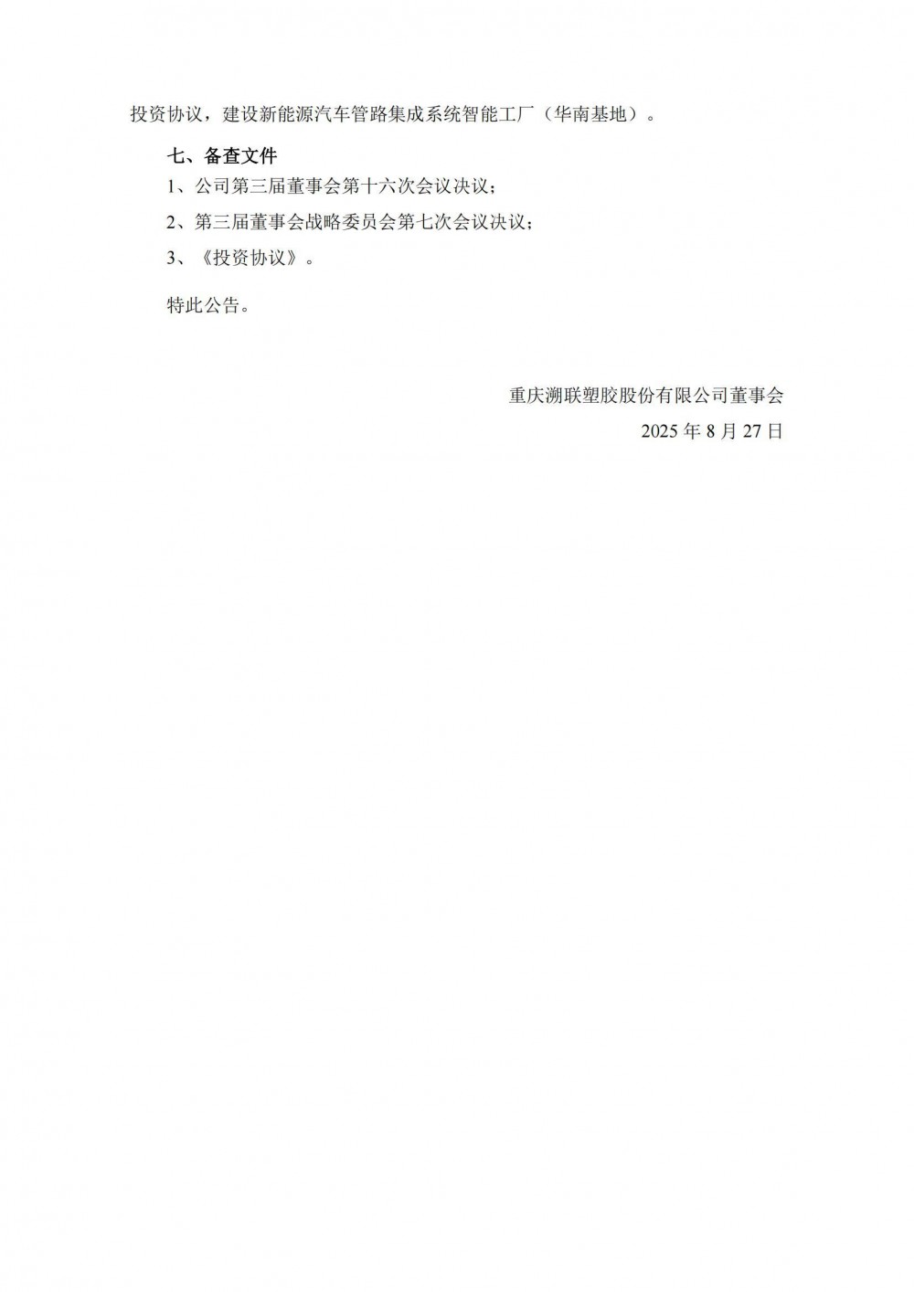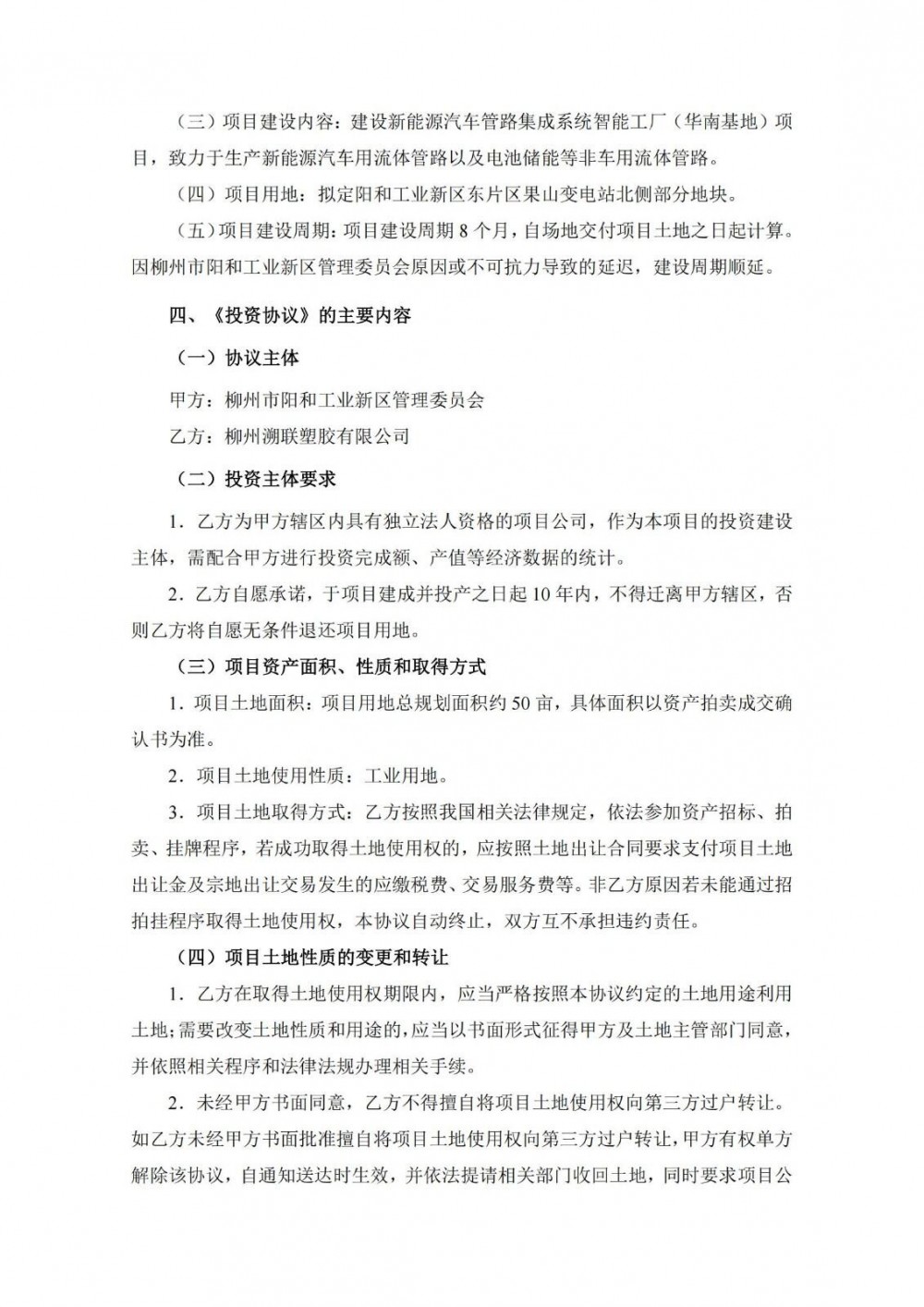 8月27日,溯联股份发布公告称,公司全资子公司柳州溯联塑胶有限公司(以下简称“柳州溯联”)拟与柳州市阳和工业新区管理委员会签署《投资协议》,以自有资金及自筹资金在柳州市阳和工业新区投资人民币2.5亿元,建设新能源汽车管路集成系统智能工厂(华南基地)。