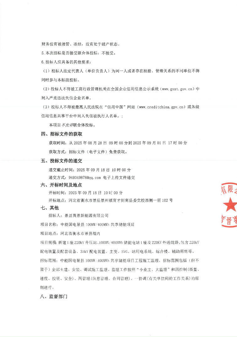 8月28日,中能国电景县100MW400MWh共享储能项目施工总承包招标公告发布。