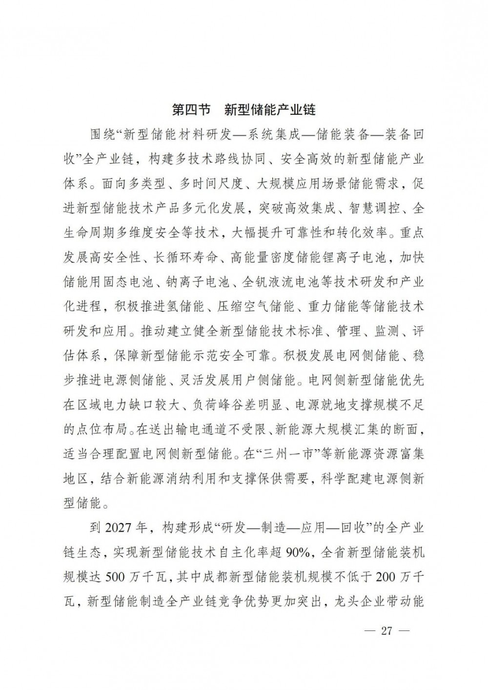 到2027年,构建形成“研发—制造—应用—回收”的全产业链生态,实现新型储能技术自主化率超90%,全省新型储能装机规模达500万千瓦,其中成都新型储能装机规模不低于200万千瓦,新型储能制造全产业链竞争优势更加突出,龙头企业带动能力显著增强,产业集群和生态体系不断完善,构建具有较强国际竞争力的新型储能产业链。