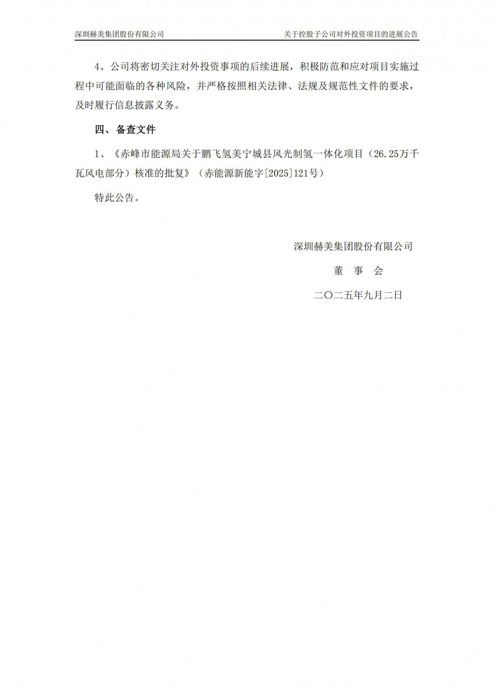 近日,赫美集团发布公告称,公司控股子公司鹏飞氢美(宁城)新能源科技有限公司于近日取得赤峰市能源局发至宁城县发展和改革委员会的《关于鹏飞氢美宁城县风光制氢一体化项目(26.25万千瓦风电部分)核准的批复》。