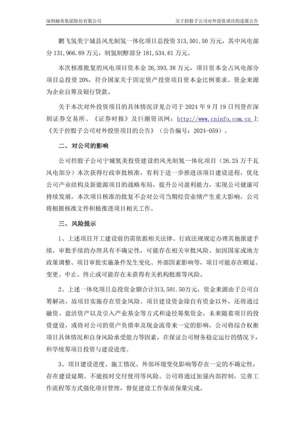 赫美集团表示,公司控股子公司宁城氢美投资建设的风光制氢一体化项目(26.25万千瓦风电部分)本次获得行政审批核准,有利于进一步推进该项目建设进程,优化公司产业结构及新能源项目的战略布局,提升公司盈利能力,实现公司健康可持续发展。本次项目核准的批复不会对公司当期经营业绩产生重大影响,公司将根据核准文件积极推进项目相关工作。