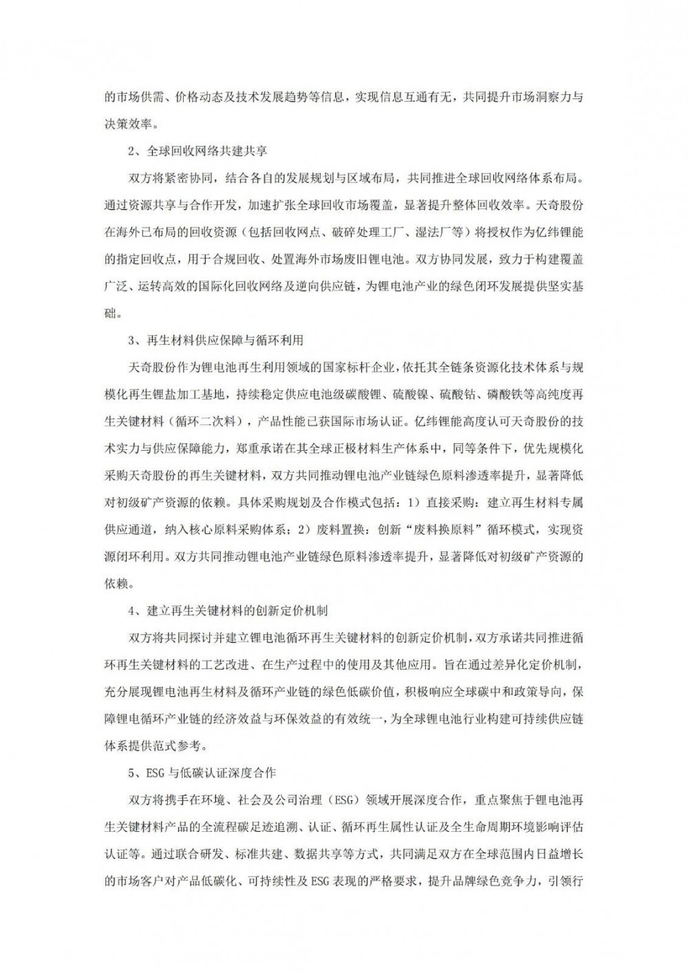 天奇股份作为锂电池再生利用领域的国家标杆企业,依托其全链条资源化技术体系与规模化再生锂盐加工基地,持续稳定供应电池级碳酸锂、硫酸镍、硫酸钴、磷酸铁等高纯度再生关键材料(循环二次料),产品性能已获国际市场认证。亿纬锂能高度认可天奇股份的技术实力与供应保障能力,郑重承诺在其全球正极材料生产体系中,同等条件下,优先规模化采购天奇股份的再生关键材料,双方共同推动锂电池产业链绿色原料渗透率提升,显著降低对初级矿产资源的依赖。具体采购规划及合作模式包括:1)直接采购:建立再生材料专属供应通道,纳入核心原料采购体系;2)废料置换:创新“废料换原料”循环模式,实现资源闭环利用。双方共同推动锂电池产业链绿色原料渗透率提升,显著降低对初级矿产资源的依赖。