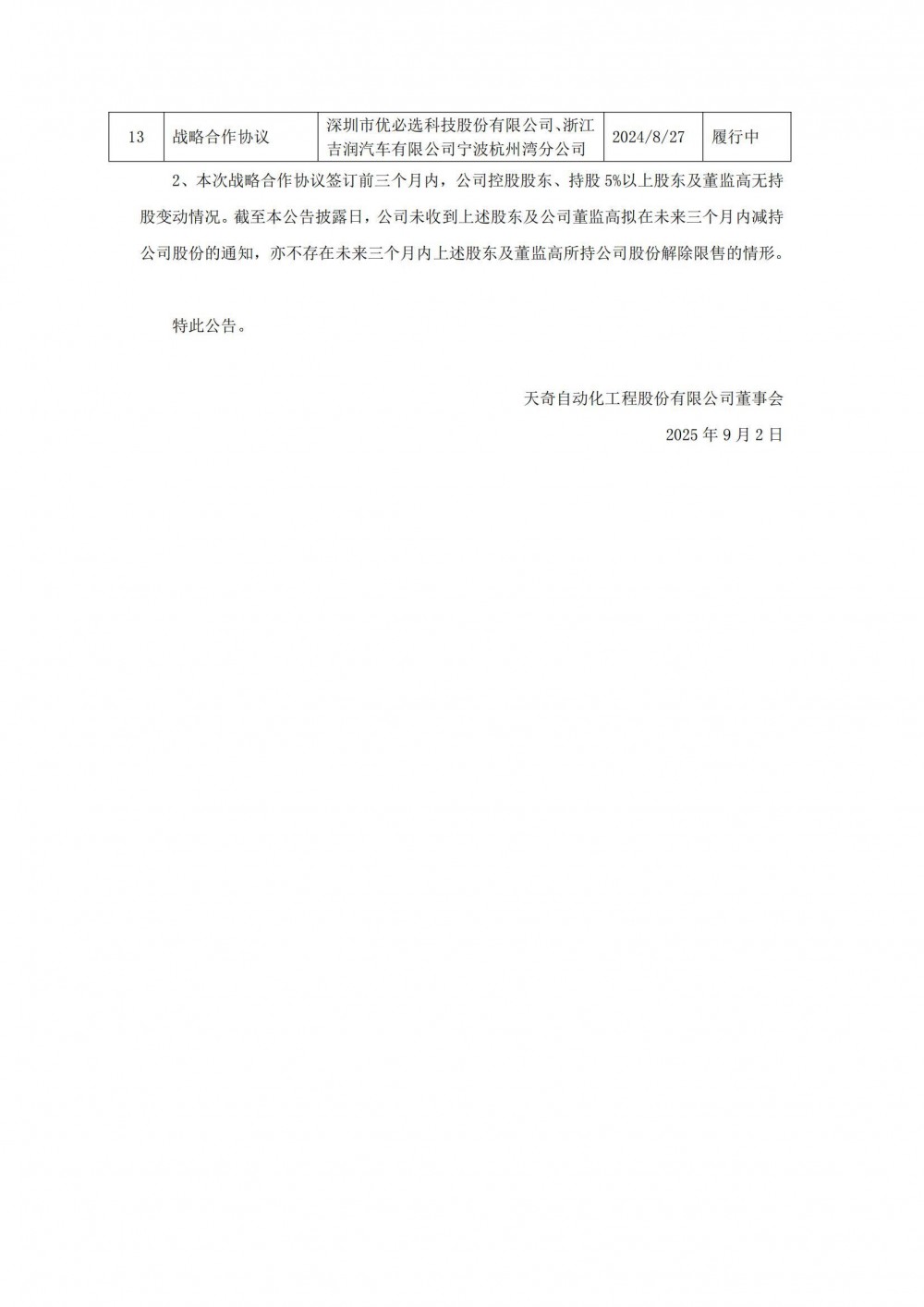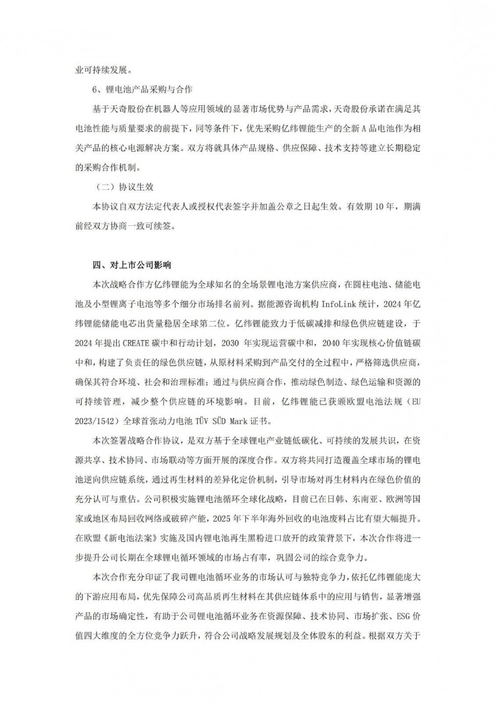 基于天奇股份在机器人等应用领域的显著市场优势与产品需求,天奇股份承诺在满足其电池性能与质量要求的前提下,同等条件下,优先采购亿纬锂能生产的全新A品电池作为相关产品的核心电源解决方案。双方将就具体产品规格、供应保障、技术支持等建立长期稳定的采购合作机制。