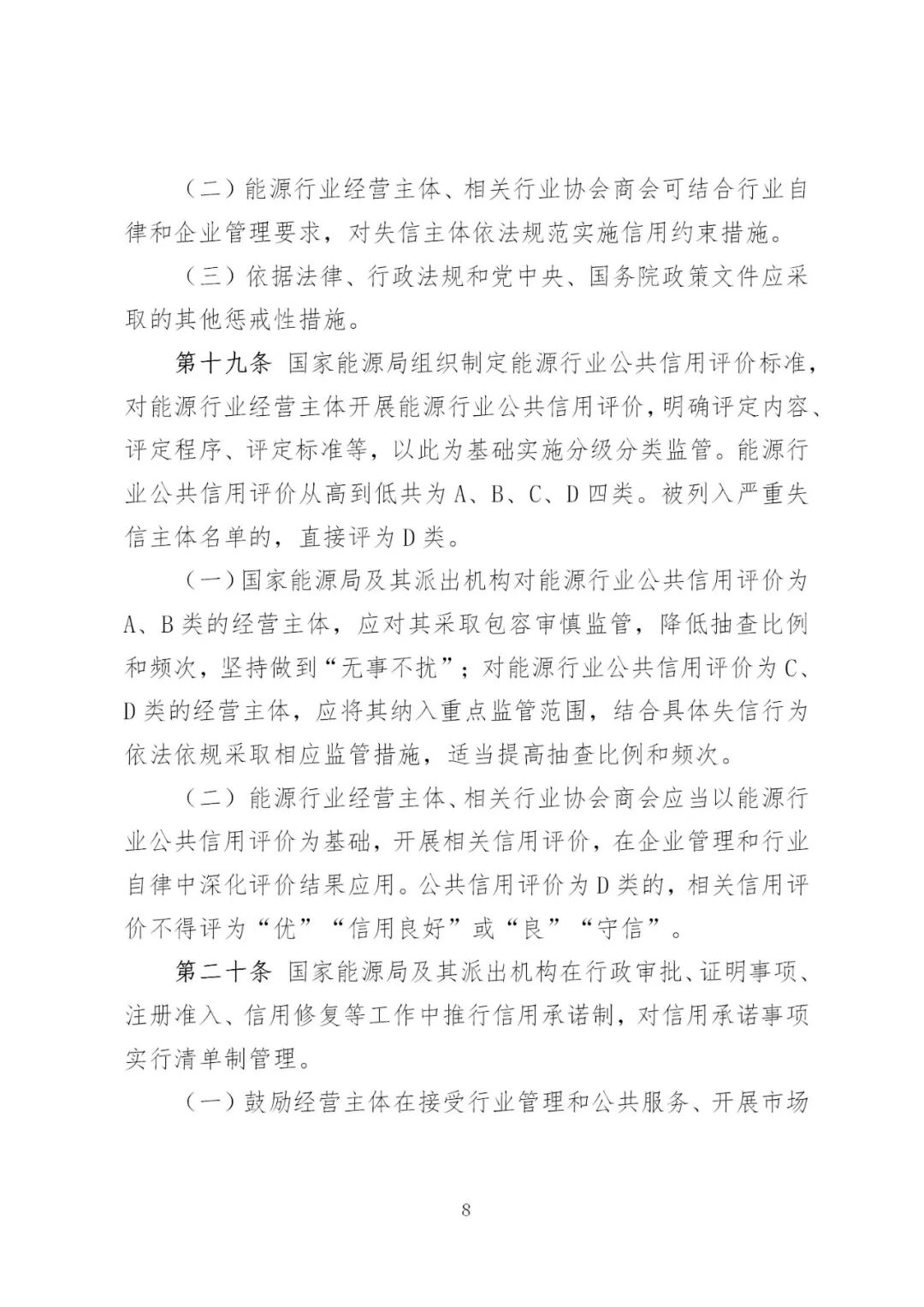 国家能源局组织制定能源行业公共信用评价标准,对能源行业经营主体开展能源行业公共信用评价,明确评定内容、评定程序、评定标准等,以此为基础实施分级分类监管。能源行业公共信用评价从高到低共为A、B、C、D四类。被列入严重失信主体名单的,直接评为D类。
