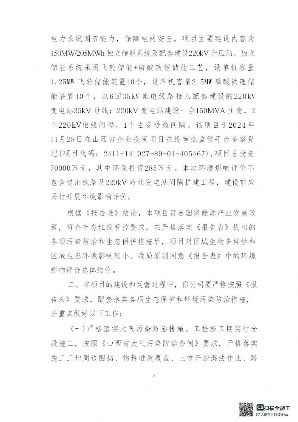 该项目于2024年11月28日在山西省企业投资项目在线审批监管平台备案登记,项目总投资70000万元,其中环保投资285万元。