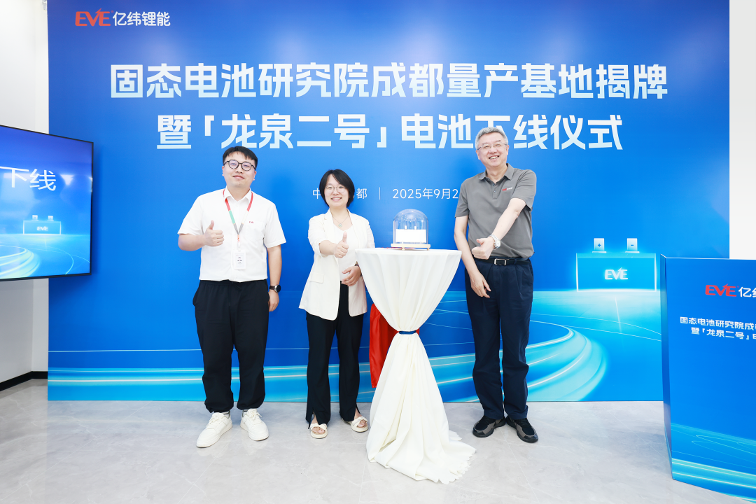 2025年9月2日,亿纬锂能固态电池研究院成都量产基地正式揭牌,“龙泉二号”全固态电池成功下线。亿纬锂能董事长刘金成博士,副总裁、科技委主任祝媛,中央研究院院长赵瑞瑞博士及各位嘉宾共同出席仪式,见证公司固态电池产业化迈出关键一步。