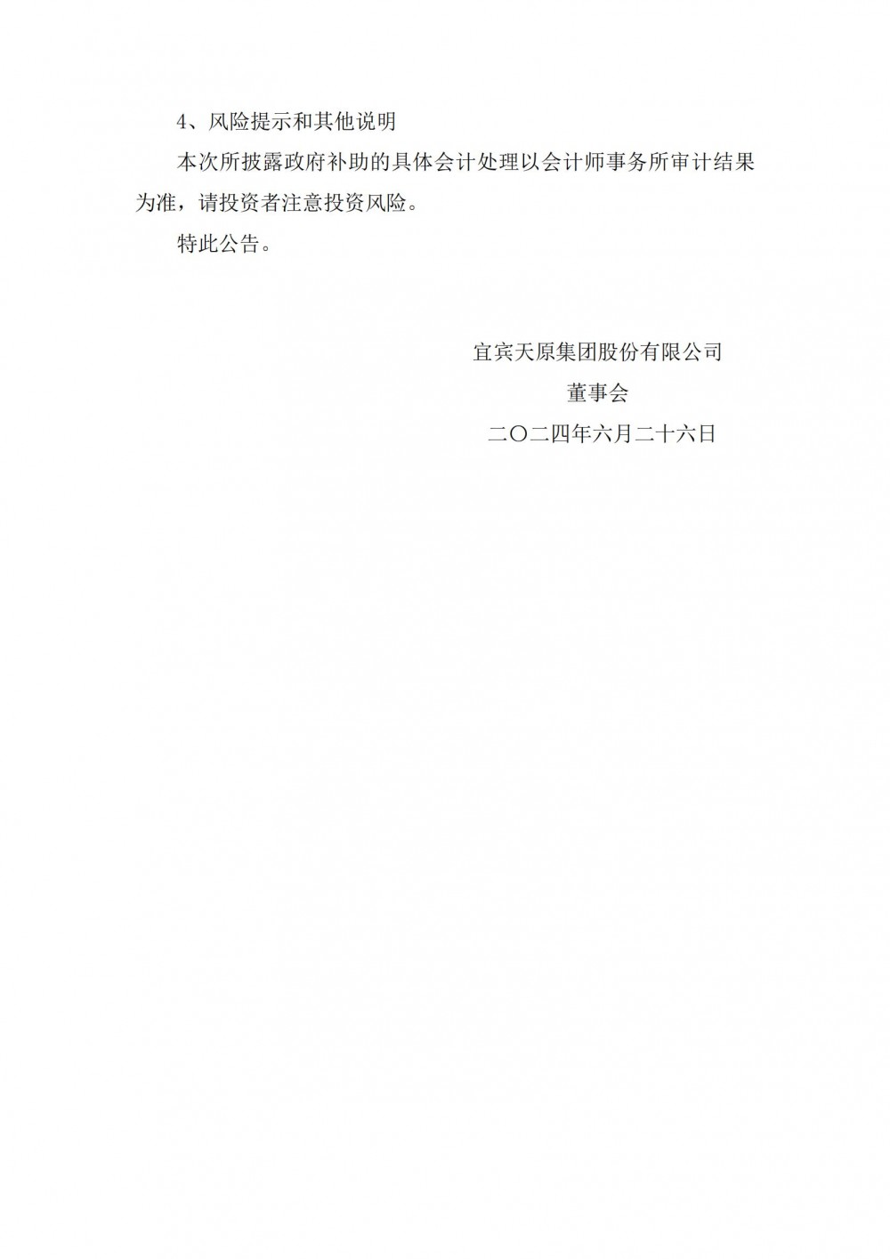 天原股份表示,本次披露所收到的与收益相关的政府补助预计将增加本年度利润总额600万元,最终结果以会计师事务所审计结果为准。