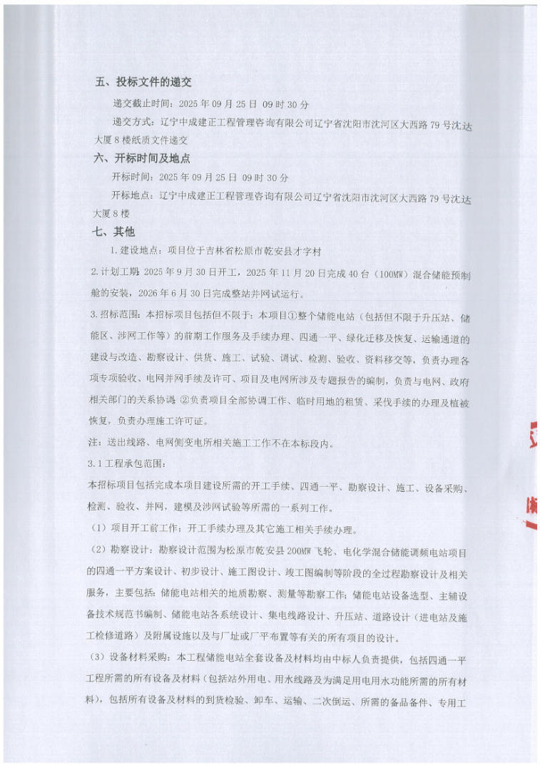9月4日,松原市乾安县200MW飞轮、电化学混合储能调频电站(EPC)项目招标公告发布。