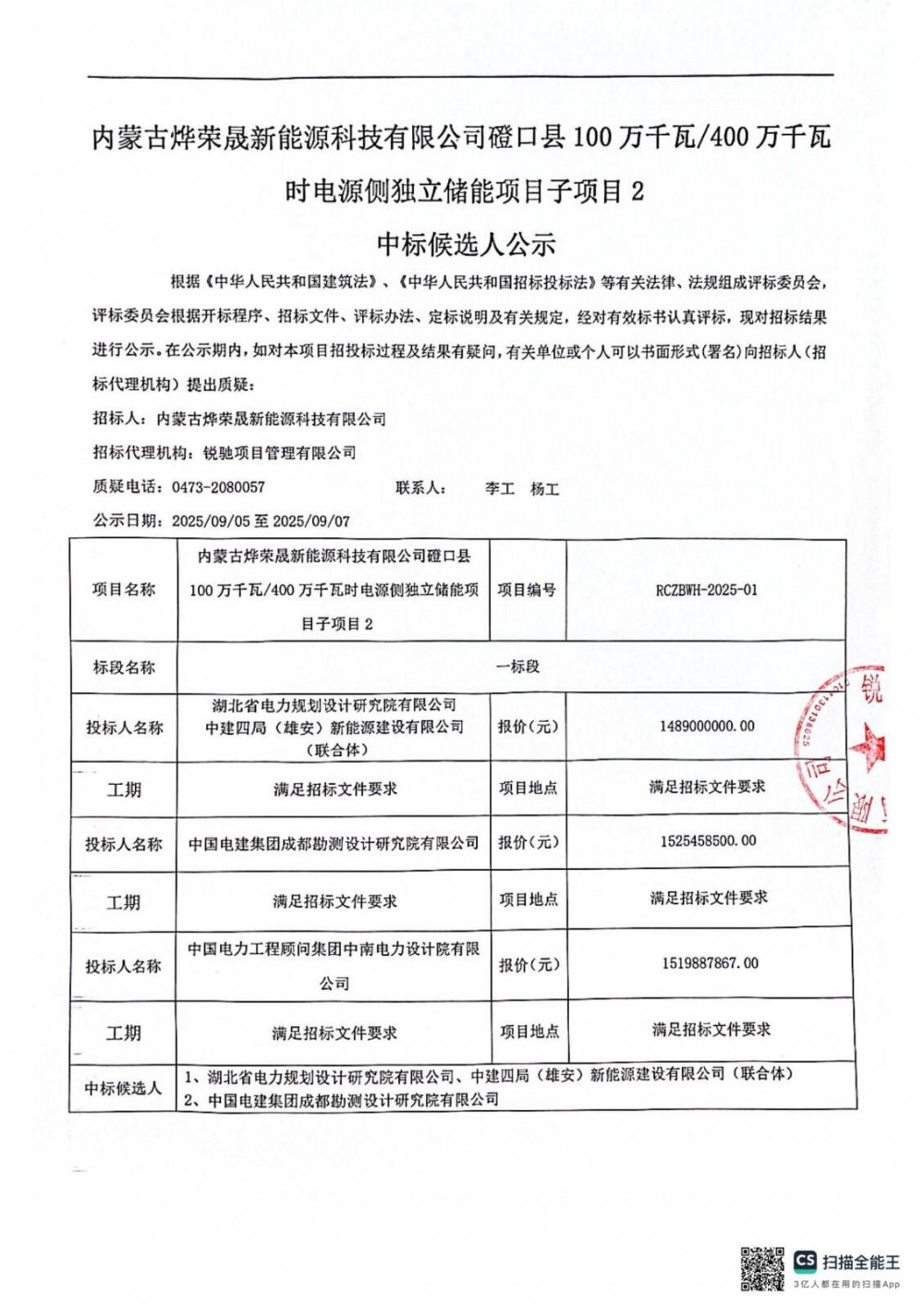 9月4日,内蒙古烨荣晟新能源科技有限公司磴口县100万千瓦/400万千瓦时电源侧独立储能项目子项目2 EPC总承包中标候选人公示。