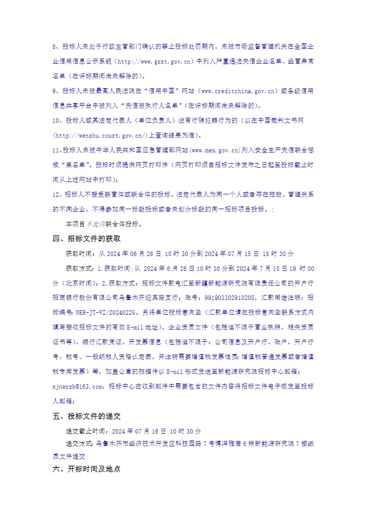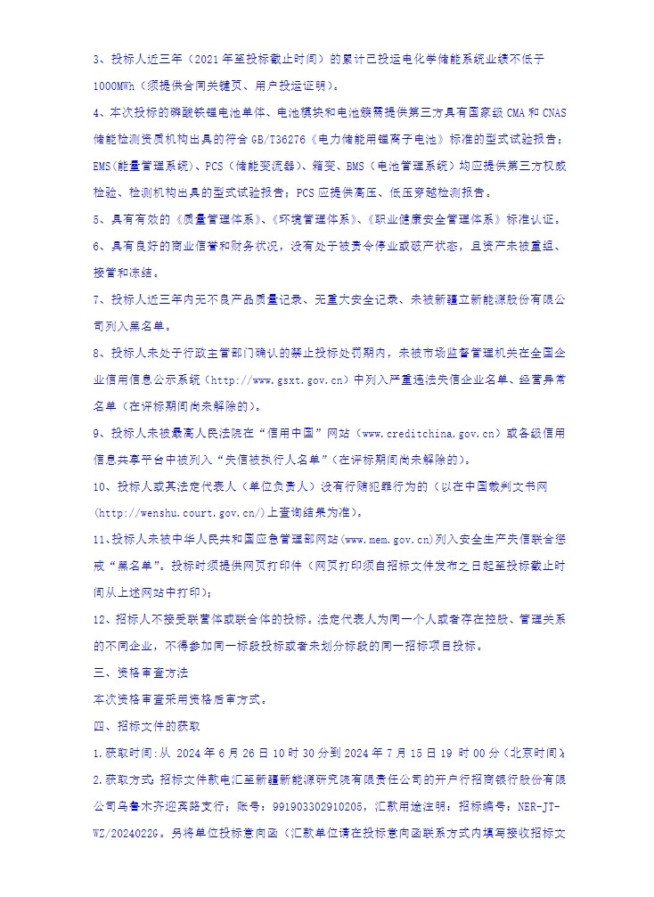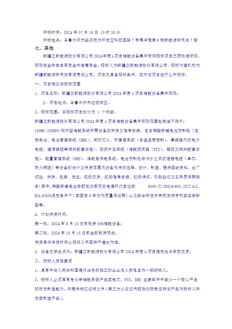 公告显示,新疆立新能源股份有限公司2024年度A项目储能设备集中采购范围包括但不限于:100MW/200MWh构网型储能系统所需设备的供货及指导安装,包含磷酸铁锂电池预制舱(包括电池、电池管理系统(BMS)、消防灭火、热管理系统(含温湿度控制)、集装箱内的电力电缆、通信线缆等相关配套设施)、变流升压系统(储能变流器(PCS)、箱变及相关配套设施)、能量管理系统(EMS)、储能自供电系统、电池预制舱与PCS之间的连接电缆(单芯、耐火铜缆)等设备的设计及供货范围内设备元件的选择、设计、制造、提供图纸资料、出厂试验、供货、包装、发运、现场交货、现场指导安装、现场调试、协助验收及五年质保期服务(其中,磷酸铁锂电池按额定功率充放电循环次数达到6000次或固定8年作为质量保证期)以及联合研发并申报发明专利或实用新型等。
