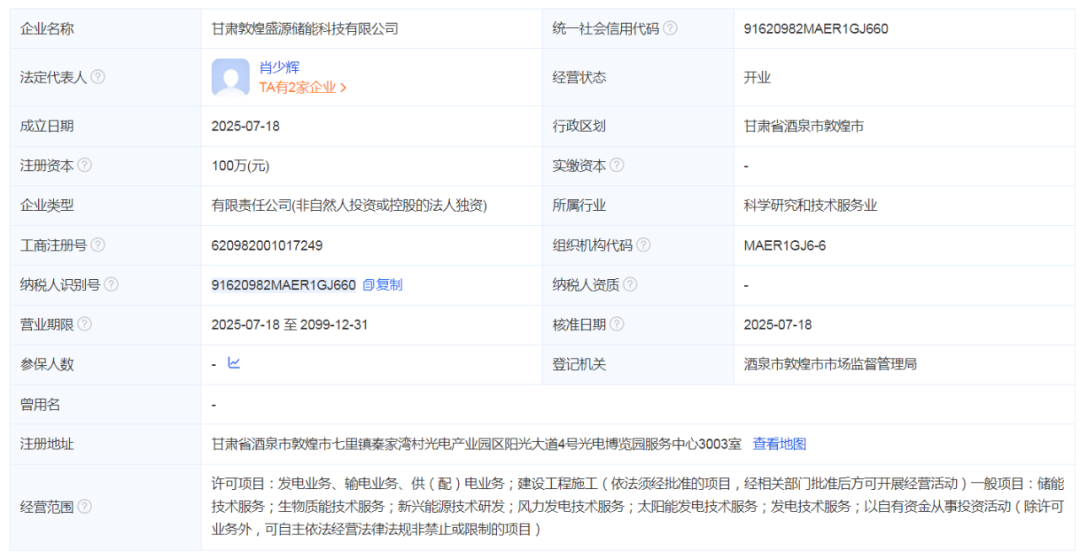 紧接着,7月18日,甘肃敦煌盛源储能科技有限公司在甘肃酒泉敦煌市七里镇秦家湾村光电产业园区阳光大道4号光电博览园服务中心3003室正式成立,注册资本100万元。