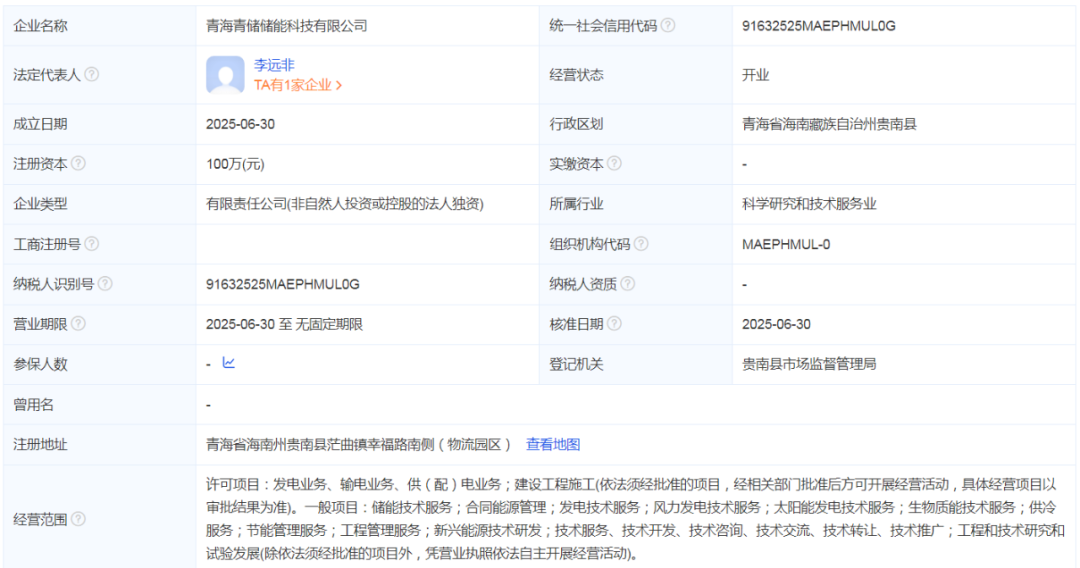 7月22日,青海青储储能科技有限公司在青海省海南州贵南县成立,由中国能建间接全资控股。
