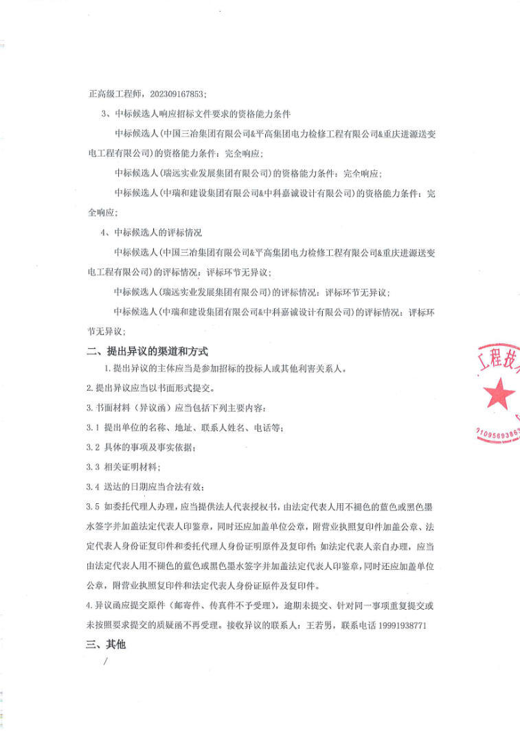 第一中标候选人为中国三冶集团有限公司&平高集团电力检修工程有限公司&重庆进源送变电工程有限公司,投标报价为51520万元,折合单价1.12元/Wh;第二中标候选人为瑞远实业发展集团有限公司,投标报价为50000万元,折合单价1.087元/Wh;第三中标候选人为中瑞和建设集团有限公司&中科嘉诚设计有限公司,投标报价为53200万元,折合单价1.1565元/Wh。