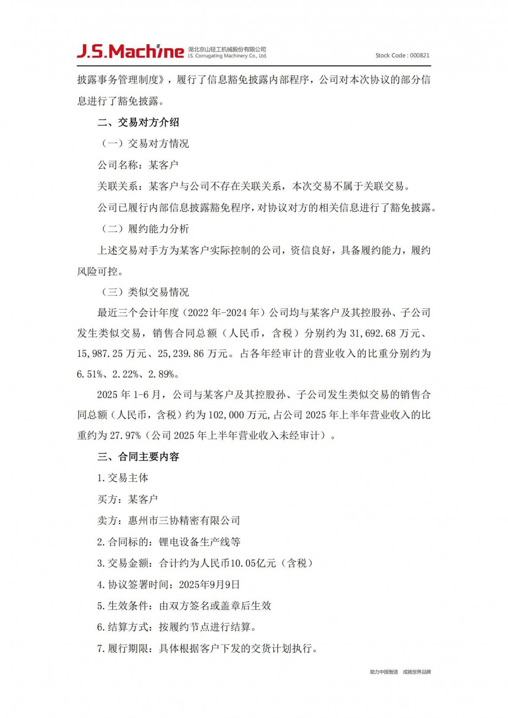 9月9日,京山轻机发布公告称,公司全资子公司惠州市三协精密有限公司于近日与锂电某龙头企业客户的全资子公司签署了日常采购订单协议,总金额约为人民币10.05亿元(含税),占公司2024年度经审计营业收入的11.52%,占三协精密2024年度经审计营业收入的201.45%。