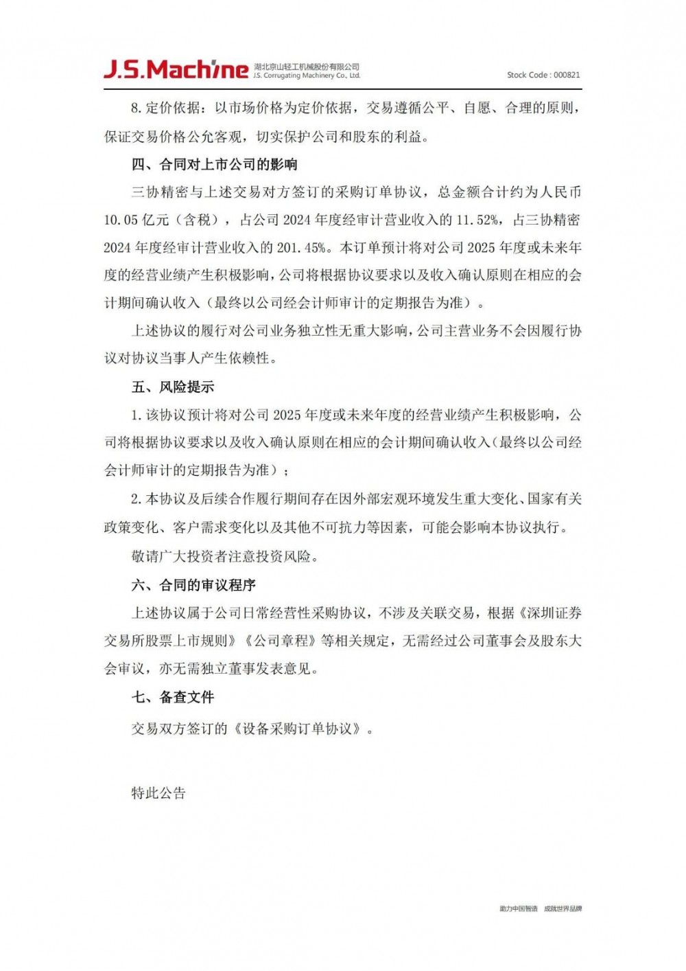 京山轻机表示,三协精密与上述交易对方签订的采购订单协议,总金额合计约为人民币10.05亿元(含税),占公司2024年度经审计营业收入的11.52%,占三协精密2024年度经审计营业收入的201.45%。本订单预计将对公司2025年度或未来年度的经营业绩产生积极影响,公司将根据协议要求以及收入确认原则在相应的会计期间确认收入。