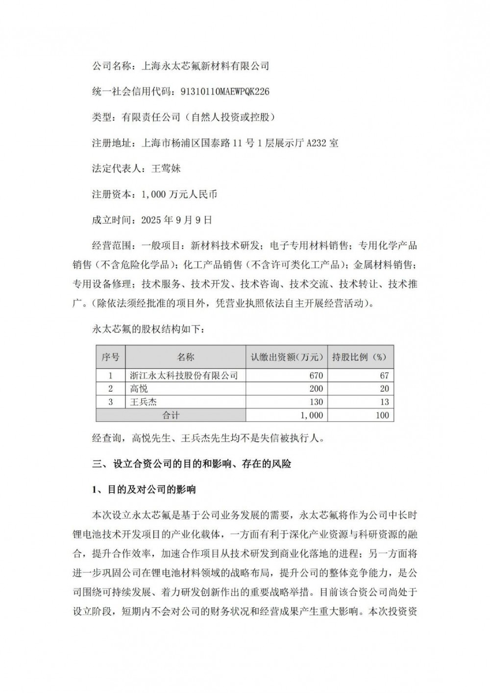 9月9日,永太科技发布公告称,公司与高悦先生、王兵杰先生共同投资设立合资公司上海永太芯氟新材料有限公司已完成工商设立登记手续,并取得了上海市杨浦区市场监督管理局颁发的《营业执照》。