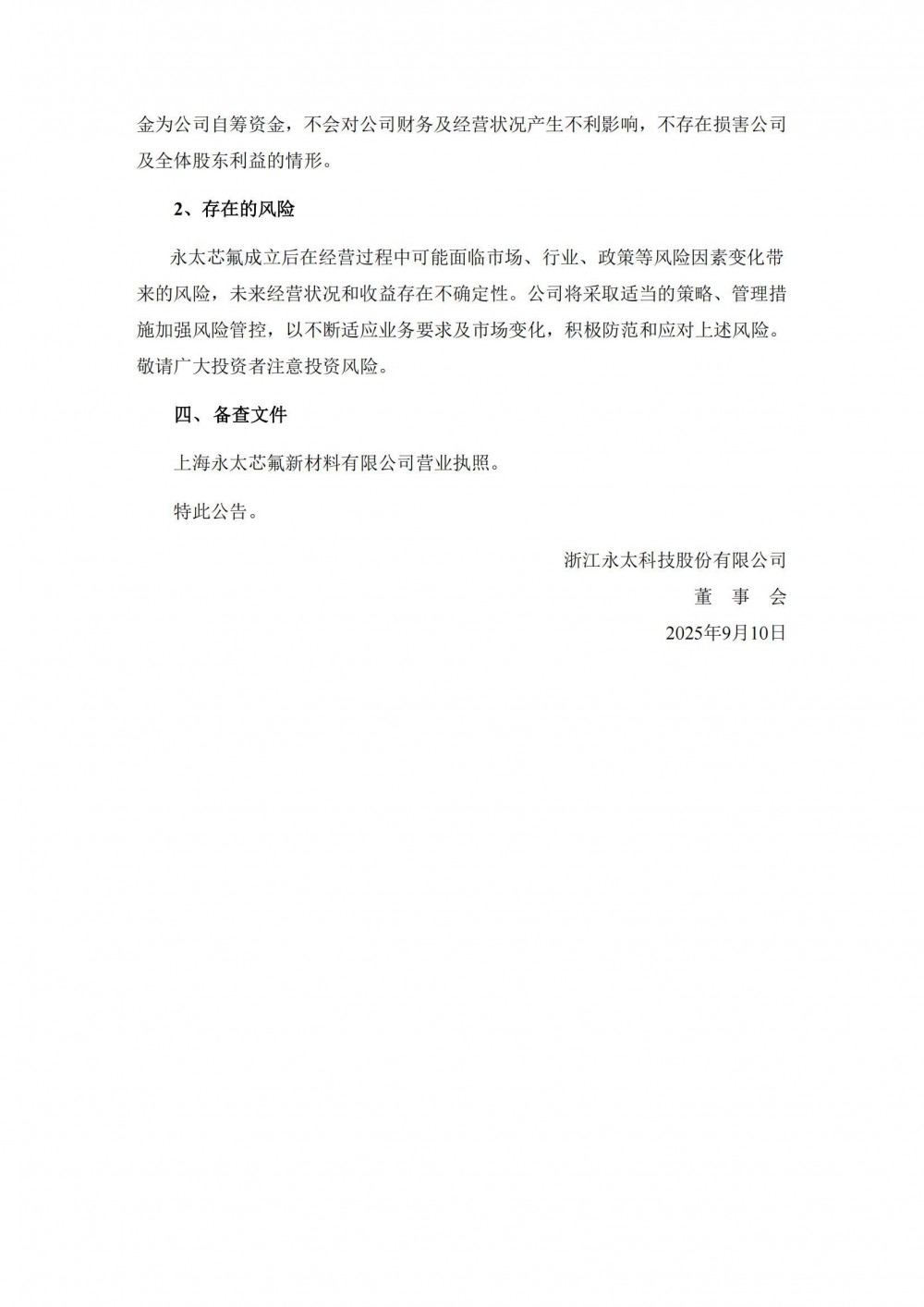 永太科技表示,本次设立永太芯氟是基于公司业务发展的需要,永太芯氟将作为公司中长时锂电池技术开发项目的产业化载体,一方面有利于深化产业资源与科研资源的融合,提升合作效率,加速合作项目从技术研发到商业化落地的进程;另一方面将进一步巩固公司在锂电池材料领域的战略布局,提升公司的整体竞争能力,是公司围绕可持续发展、着力研发创新作出的重要战略举措。目前该合资公司尚处于设立阶段,短期内不会对公司的财务状况和经营成果产生重大影响。本次投资资金为公司自筹资金,不会对公司财务及经营状况产生不利影响,不存在损害公司及全体股东利益的情形。