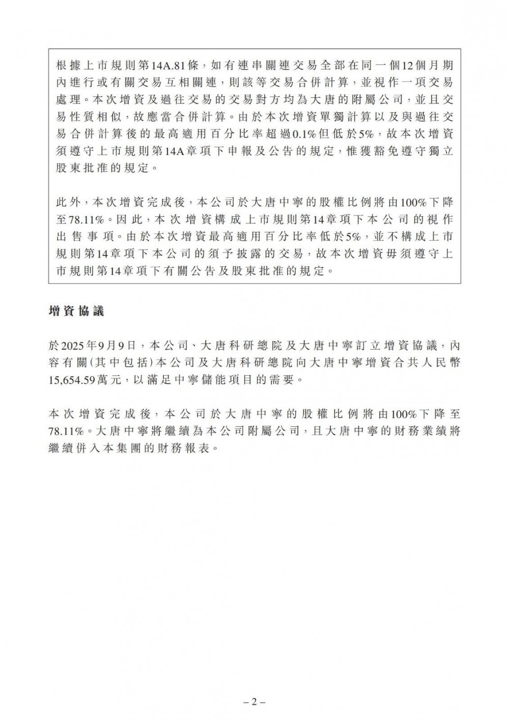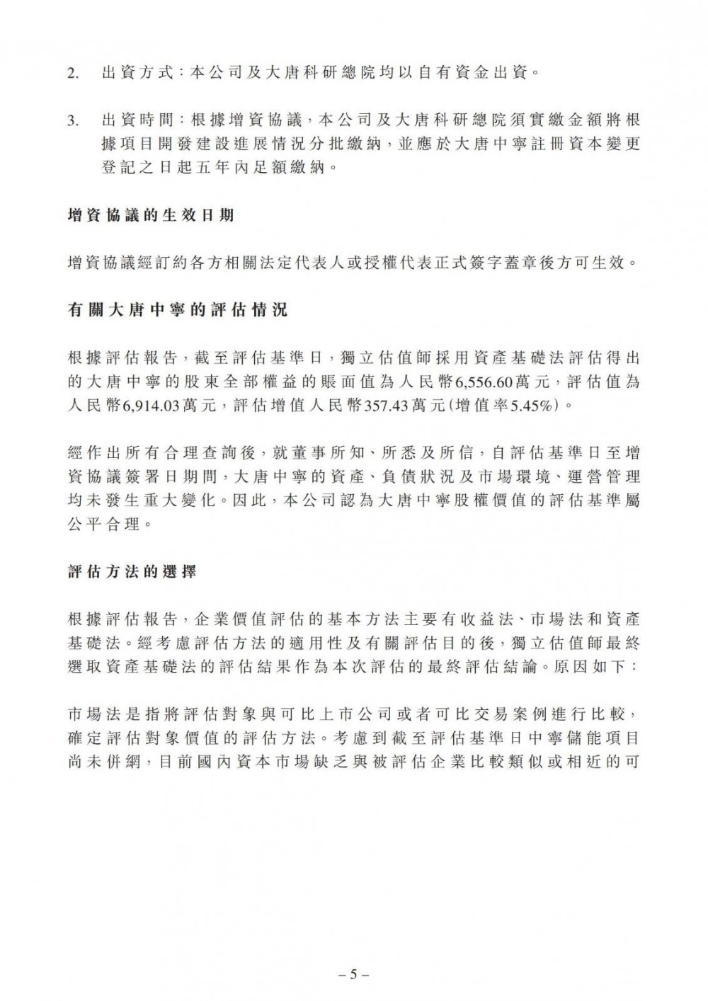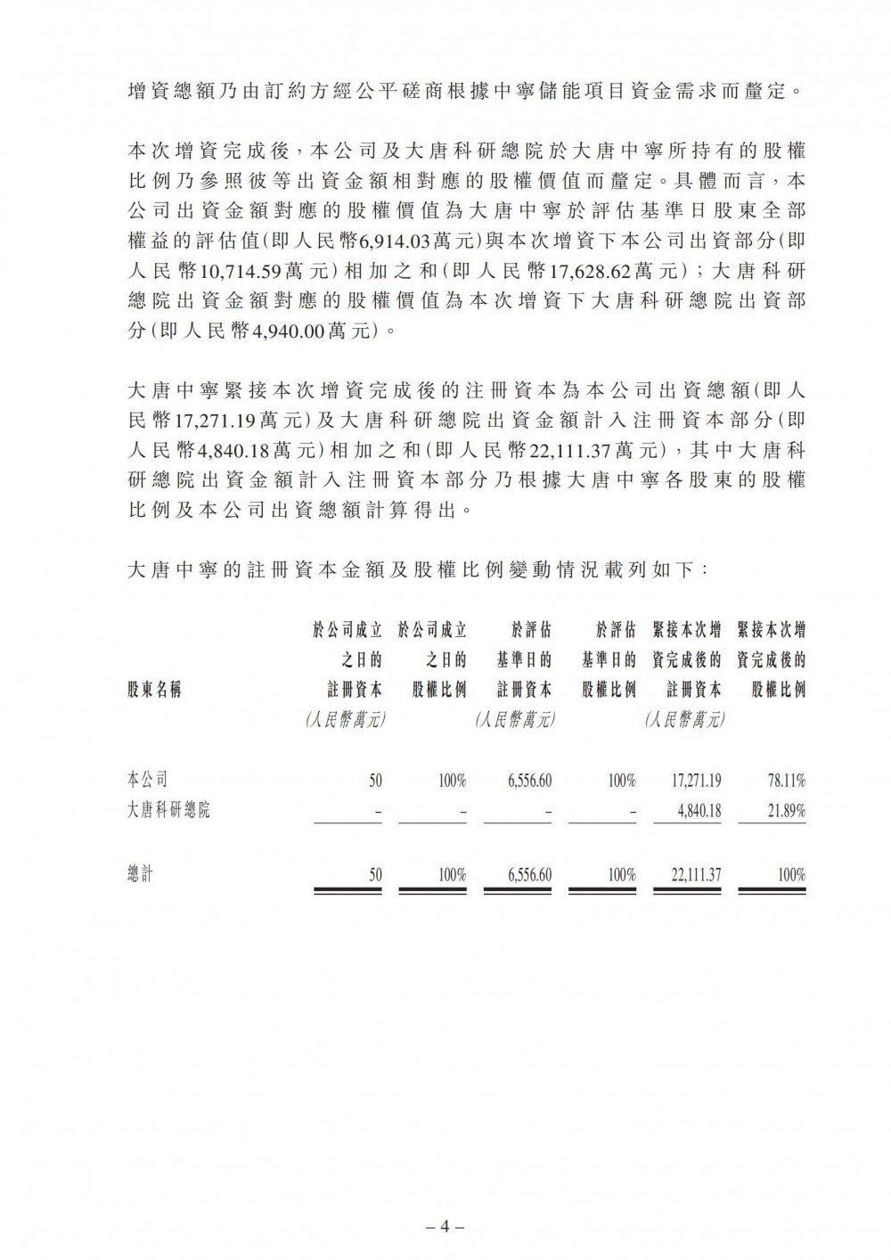 其中,公司拟以1.07亿元向大唐中宁增资。增资完成后,公司在大唐中宁的股权比例将由100%降至78.11%,大唐中宁将继续作为公司的附属公司,其财务业绩将继续并入公司的财务报表。