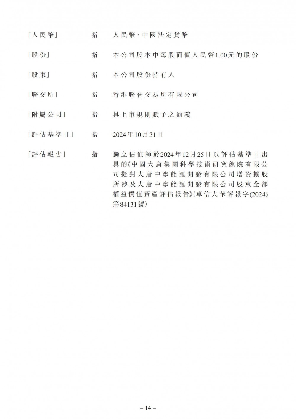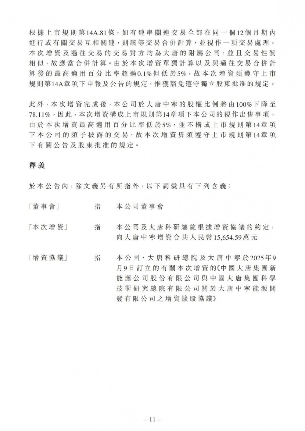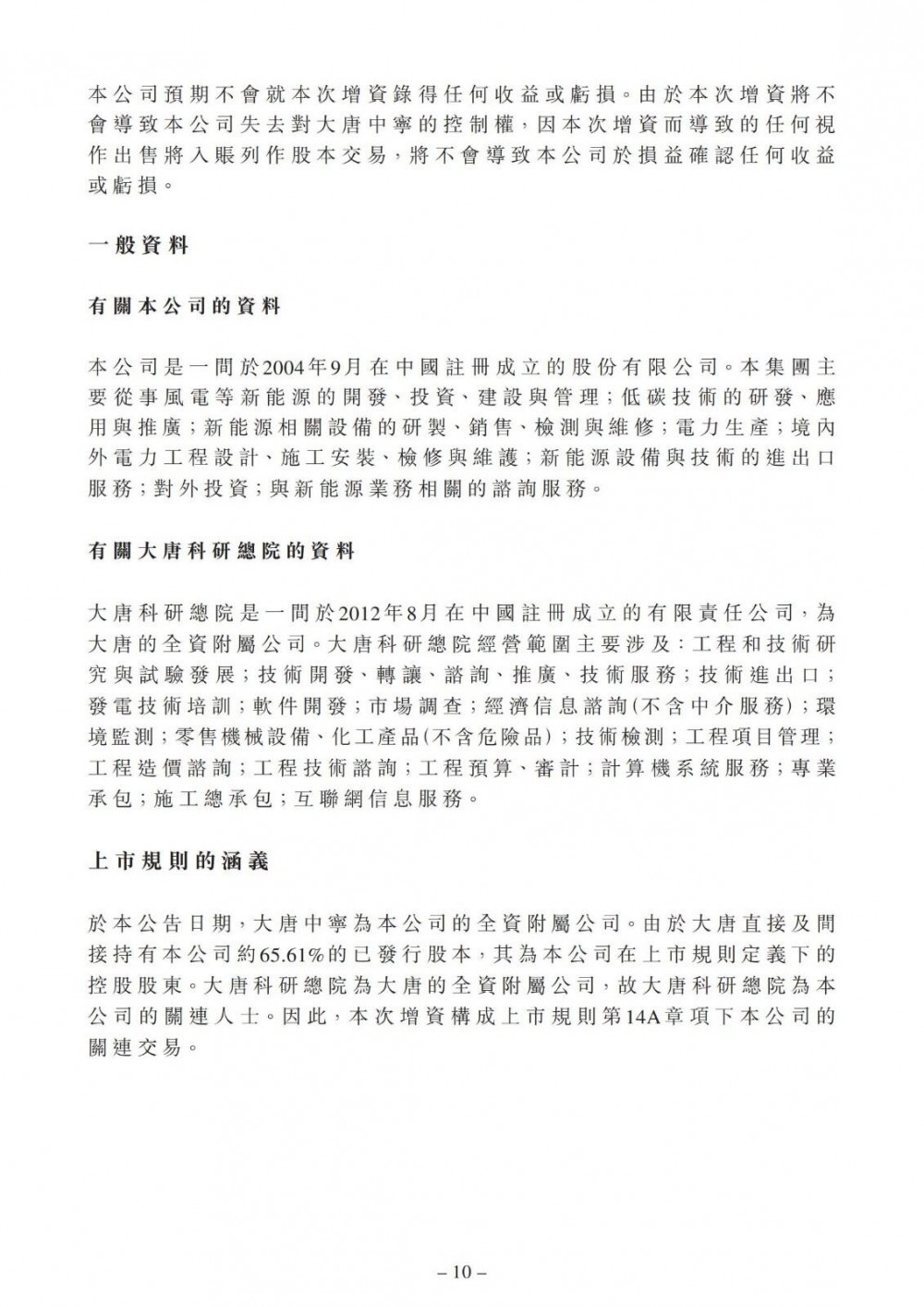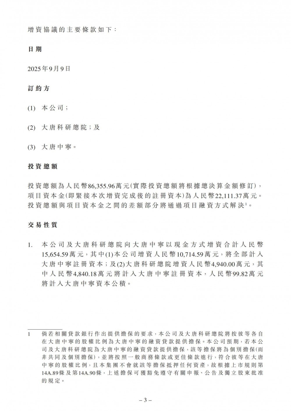 其中,公司拟以1.07亿元向大唐中宁增资。增资完成后,公司在大唐中宁的股权比例将由100%降至78.11%,大唐中宁将继续作为公司的附属公司,其财务业绩将继续并入公司的财务报表。