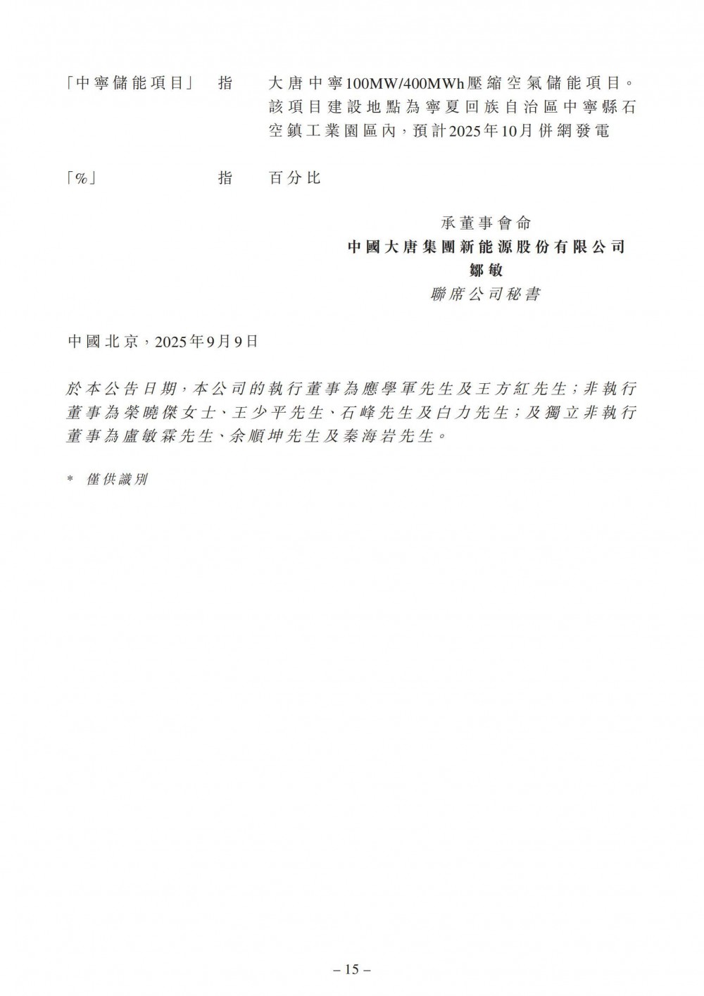 9月9日,大唐新能源发布公告称,公司与大唐科研总院及大唐中宁签署增资协议,内容涉及公司及大唐科研总院向大唐中宁增资总计1.57亿元,以满足中宁储能项目的资金需求。