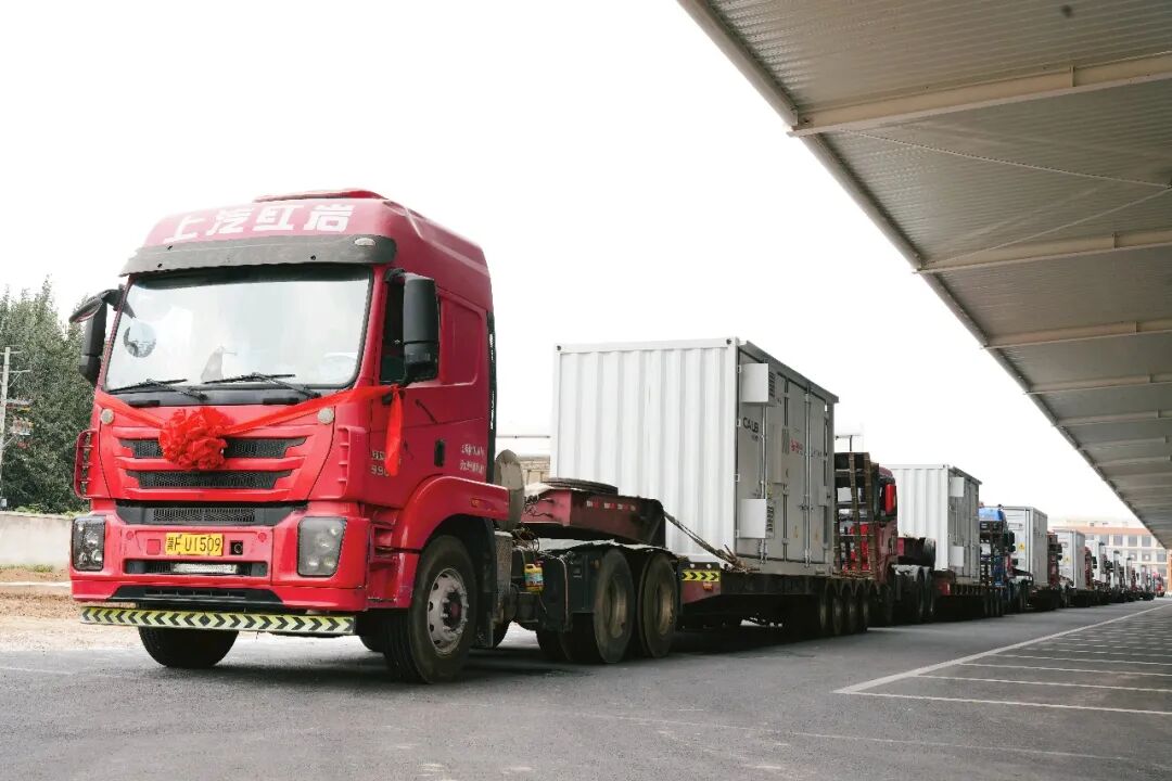 同一时刻,另一场“能源接力”也正在上演。河北科力远保定工厂启动了200MWh储能系统产品交付工作。随着指令下达,起重机将大型储能柜吊装至重型卡车上。中午13点18分,在河北科力远总经理贾文杰及公司员工的共同注视下,一辆辆满载储能柜的卡车组成“能源长龙”,正式奔赴山东临沂的罗庄独立储能电站项目。