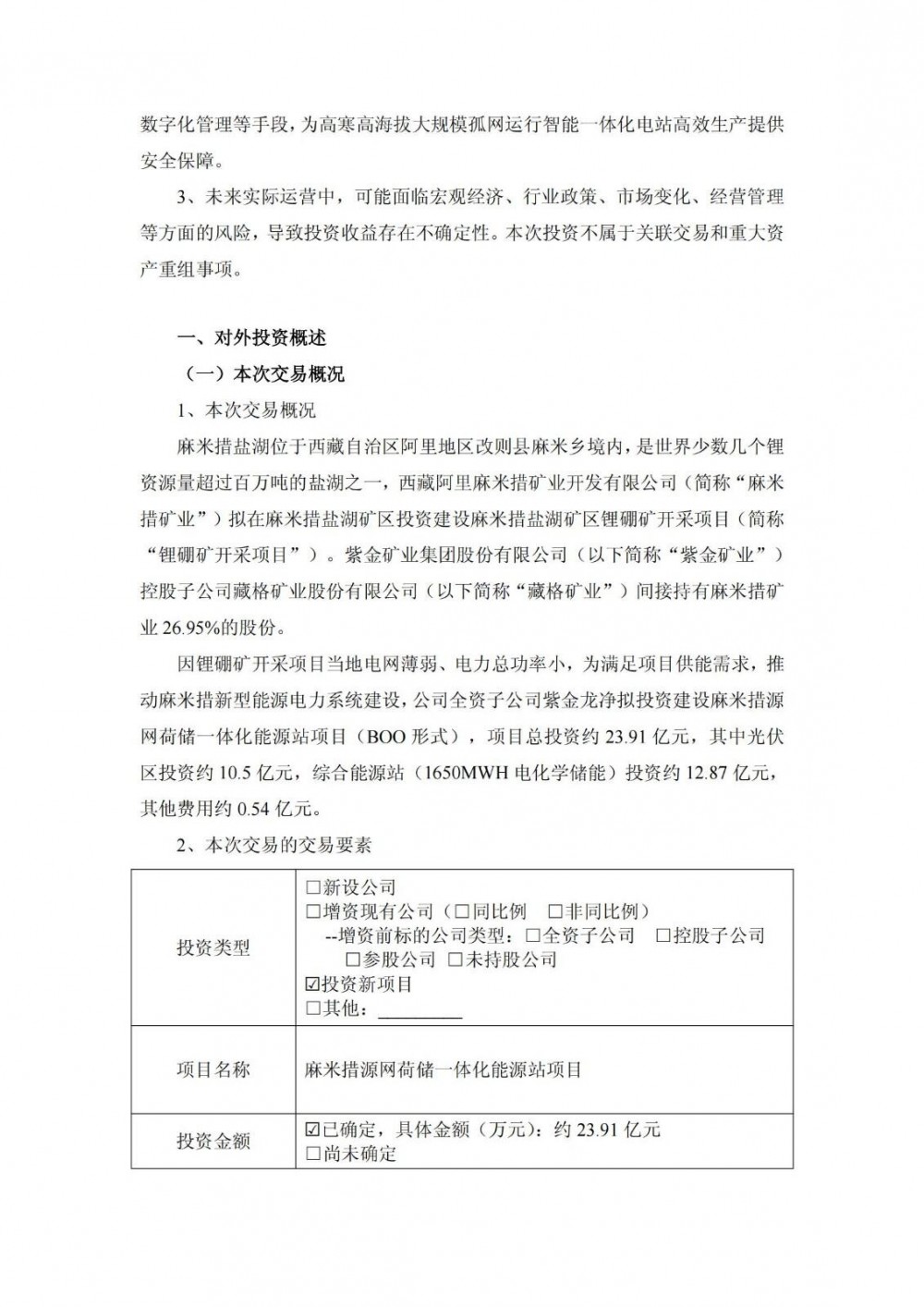 9月12日,龙净环保发布公告称,公司审议通过《关于投资建设麻米措源网荷储一体化能源站项目的议案》。公告表示,公司全资子公司紫金龙净拟在西藏自治区阿里地区改则县麻米乡境内,投资约23.91亿元建设麻米措源网荷储一体化能源站项目,项目总规模为直流侧420MWp光伏+412.5MW/1650MWh电化学储能+30MW柴发(实际出力)。
