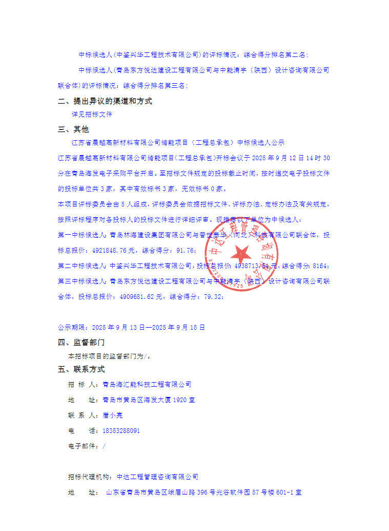 近日,江苏省晨越高新材料有限公司储能项目(工程总承包)中标候选人公示。