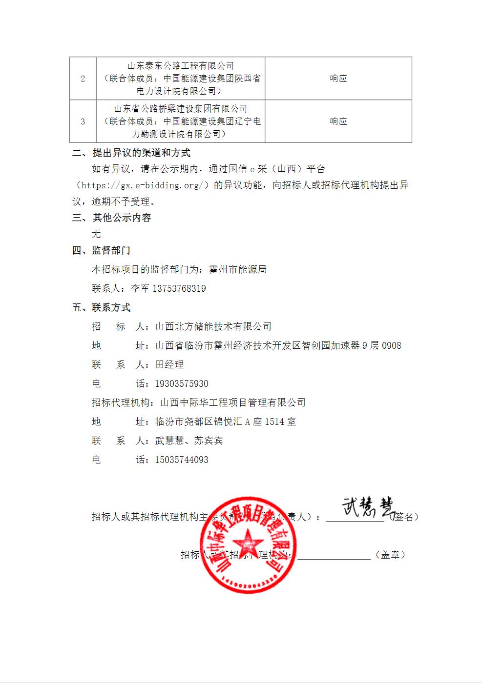第一中标候选人为山东高速工程建设集团有限公司(联合体成员:中国能源建设集团山西省电力勘测设计院有限公司),投标报价为931557060元,折合单价1.3308元/Wh;第二中标候选人为山东泰东公路工程有限公司(联合体成员:中国能源建设集团陕西省电力设计院有限公司),投标报价为937929397元,折合单价1.3399元/Wh;第三中标候选人为山东省公路桥梁建设集团有限公司(联合体成员:中国能源建设集团辽宁电力勘测设计院有限公司),投标报价为924312089元,折合单价1.3204元/Wh。
