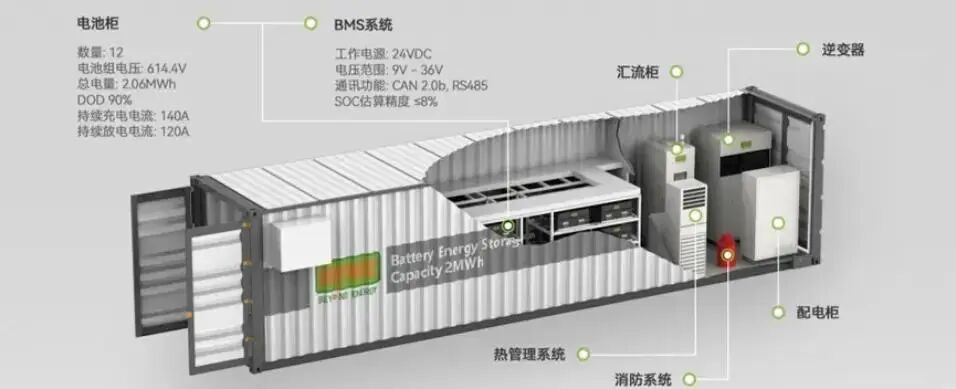 集装箱储能=高防护外壳+电池簇+温控+消防+配电+监控,俗称“Box-in-one”。常见40尺高柜,外形12.2×2.4×2.9m,占地不足30m²,重量30-35t,最大可装2-2.5MWh磷酸铁锂电池,系统级能量密度(不含土建)约为同容量室内站的两倍。
