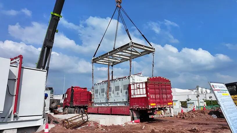 40尺箱起吊重量满载约28-30t,需使用额定≥50t吊具;陆运采用低平板车,高度4.5m,部分省份桥梁限高4.2m,需夜间护送。海运时箱内电池SOC≤30%,且插头全部短路封盖,符合IMDGCode38-20。