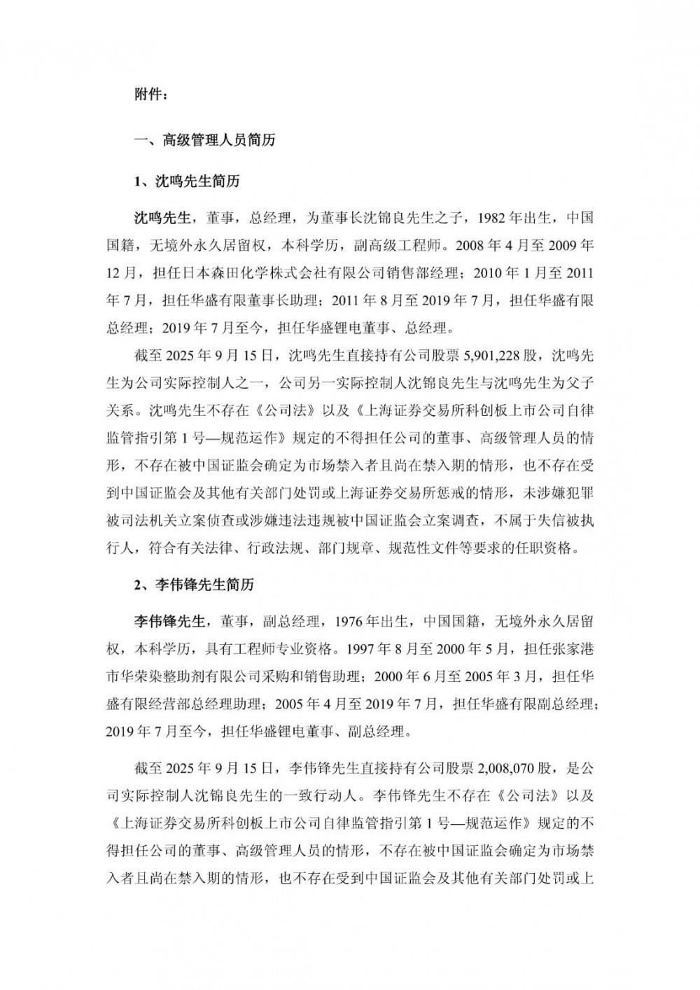 沈鸣先生,董事,总经理,为董事长沈锦良先生之子,1982年出生,中国国籍,无境外永久居留权,本科学历,副高级工程师。2008年4月至2009年12月,担任日本森田化学株式会社有限公司销售部经理;2010年1月至2011年7月,担任华盛有限董事长助理;2011年8月至2019年7月,担任华盛有限总经理;2019年7月至今,担任华盛锂电董事、总经理。