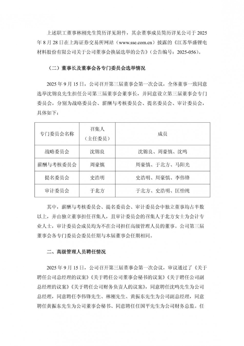 近日,华盛锂电发布公告称,公司召开职工代表大会选举林刚先生为公司第三届董事会职工代表董事。同日,公司召开2025年第二次临时股东会,审议通过了《关于换届选举第三届董事会非独立董事的议案》《关于换届选举第三届董事会独立董事的议案》,选举沈锦良先生、沈鸣先生、马阳光先生、李伟锋先生、匡怡纯女士为公司第三届董事会非独立董事,选举史浩明先生、周豪慎先生、于北方女士为公司第三届董事会独立董事。上述1名职工代表董事、5名非独立董事、3名独立董事共同组成公司第三届董事会,任期自公司2025年第二次临时股东会审议通过之日起三年。
