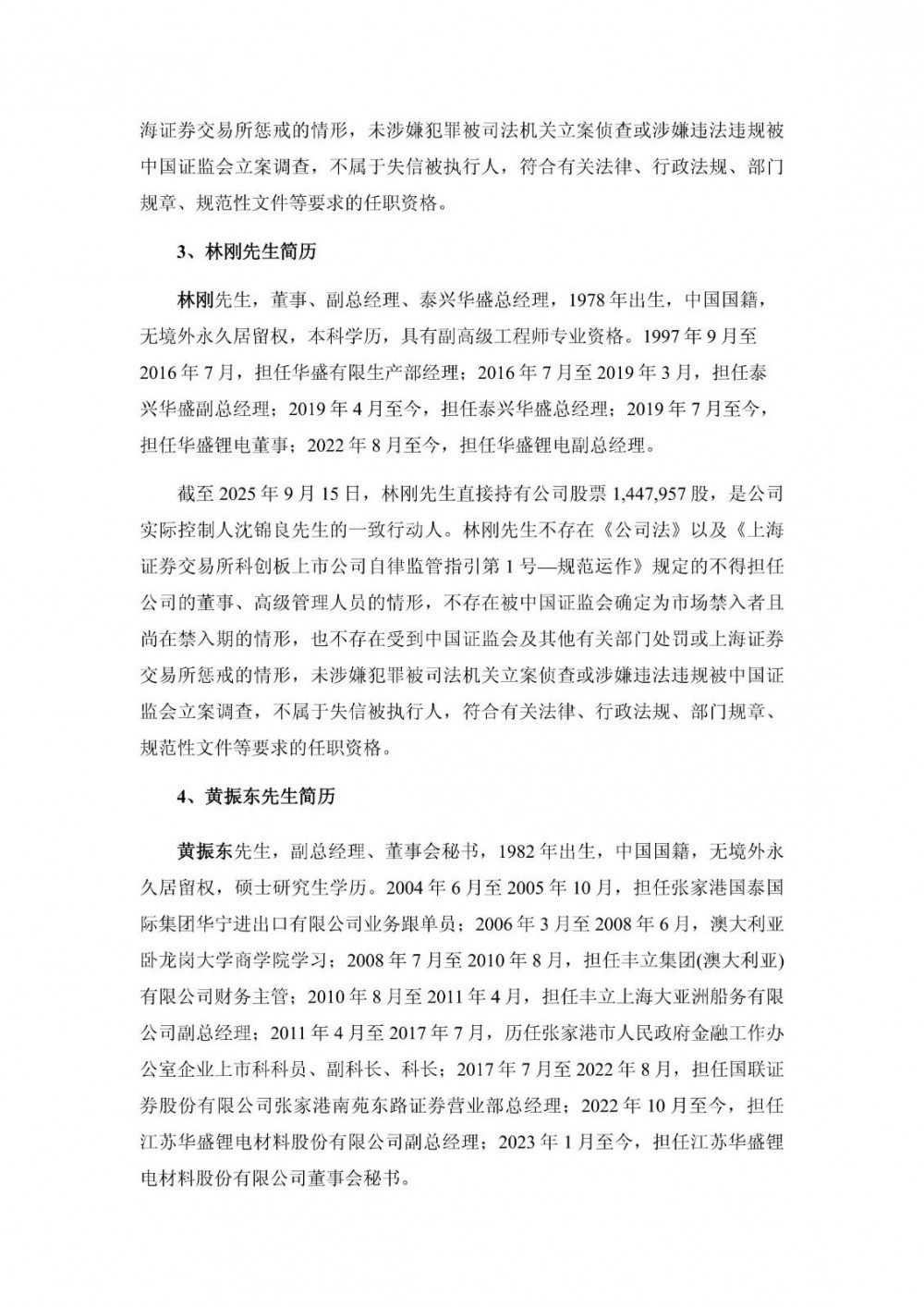 林刚先生,董事、副总经理、泰兴华盛总经理,1978年出生,中国国籍,无境外永久居留权,本科学历,具有副高级工程师专业资格。1997年9月至2016年7月,担任华盛有限生产部经理;2016年7月至2019年3月,担任泰兴华盛副总经理;2019年4月至今,担任泰兴华盛总经理;2019年7月至今,担任华盛锂电董事;2022年8月至今,担任华盛锂电副总经理。