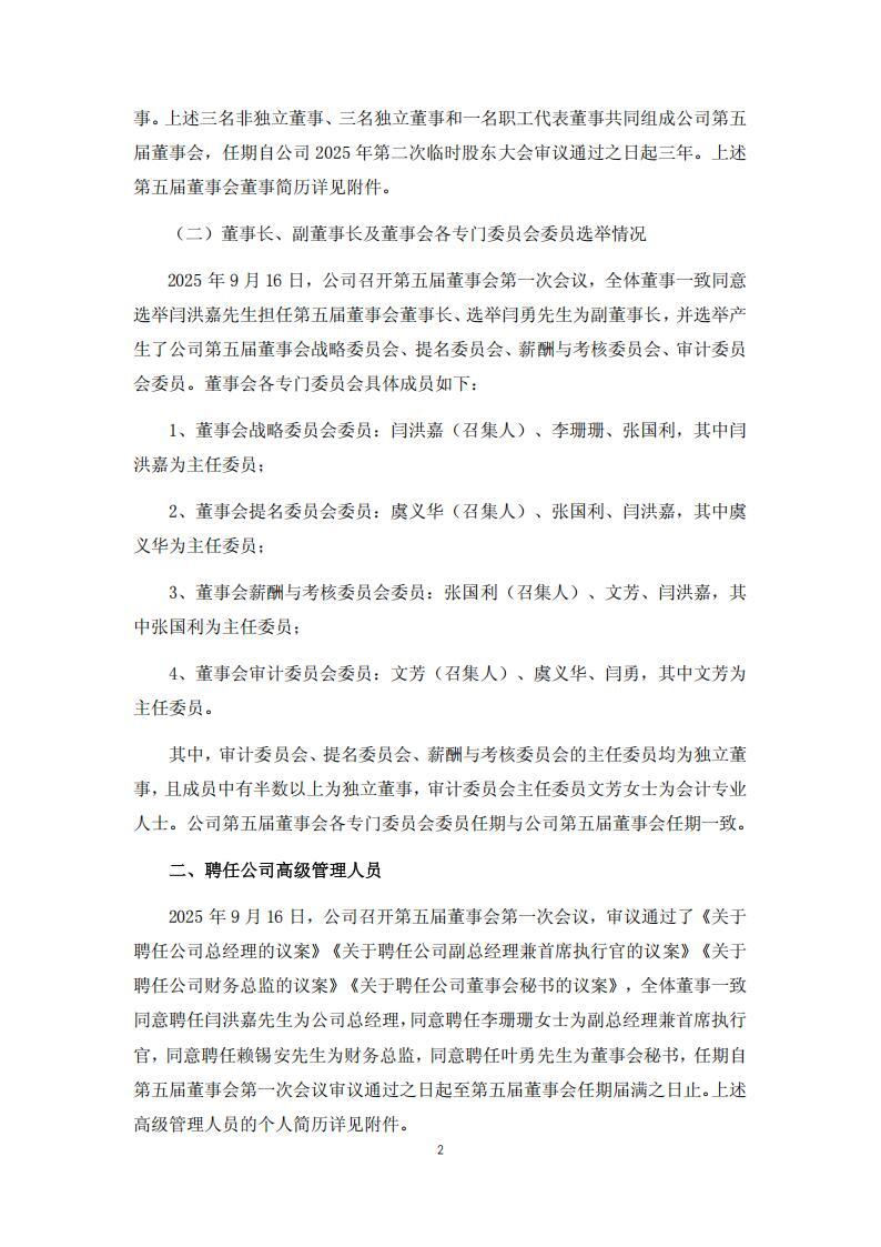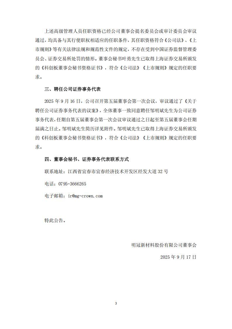9月17日,明冠新材发布关于董事会完成换届选举及聘任高级管理人员、证券事务代表的公告。