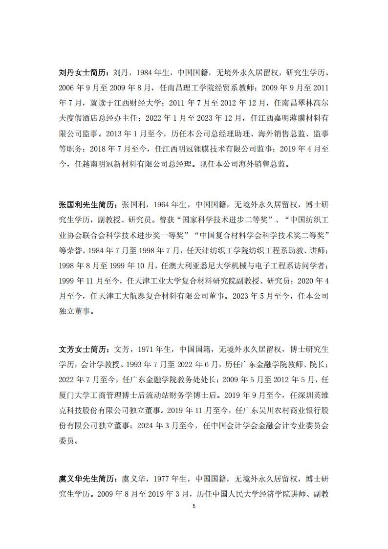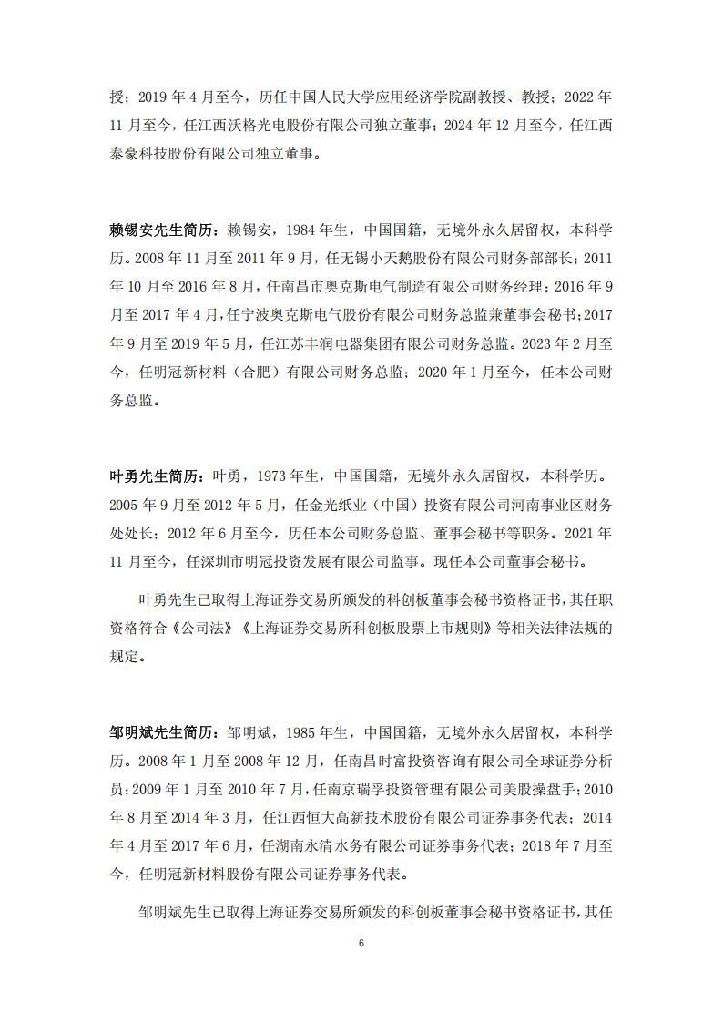 明冠新材董事一致同意聘任闫洪嘉先生为公司总经理,同意聘任李珊珊女士为副总经理兼首席执行官,同意聘任赖锡安先生为财务总监,同意聘任叶勇先生为董事会秘书,任期自第五届董事会第一次会议审议通过之日起至第五届董事会任期届满之日止。