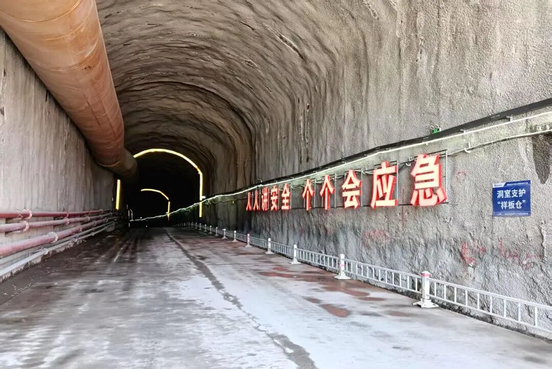进厂交通洞全长1847.907米,纵坡介于0.9%~7.5%,洞室采用城门洞型设计,净断面宽8.7米,高8.5米。自2024年7月30日正式动工以来,项目团队面对洞室穿越区域地质条件复杂,多次遭遇涌水等诸多施工难题,与参建各方紧密协作、攻坚克难,破碎岩层段施工采用短进尺、弱爆破、强支护”有效控制超挖,保持开挖面平整,最大限度减少围岩扰动。沿洞线每200米设置集水井,配备大功率潜水泵24小时不间断抽排,用分级排水确保洞室掘进的顺利推进。