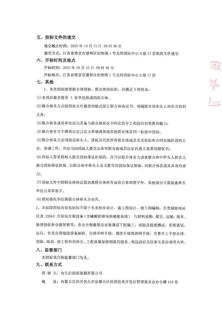 9月17日,包头启能新能源有限公司20万千瓦/120万千瓦时电网侧独立储能示范项目工程总承包(EPC)招标公告发布,项目资金来源为自筹资金145180万元,招标人为包头启能新能源有限公司。