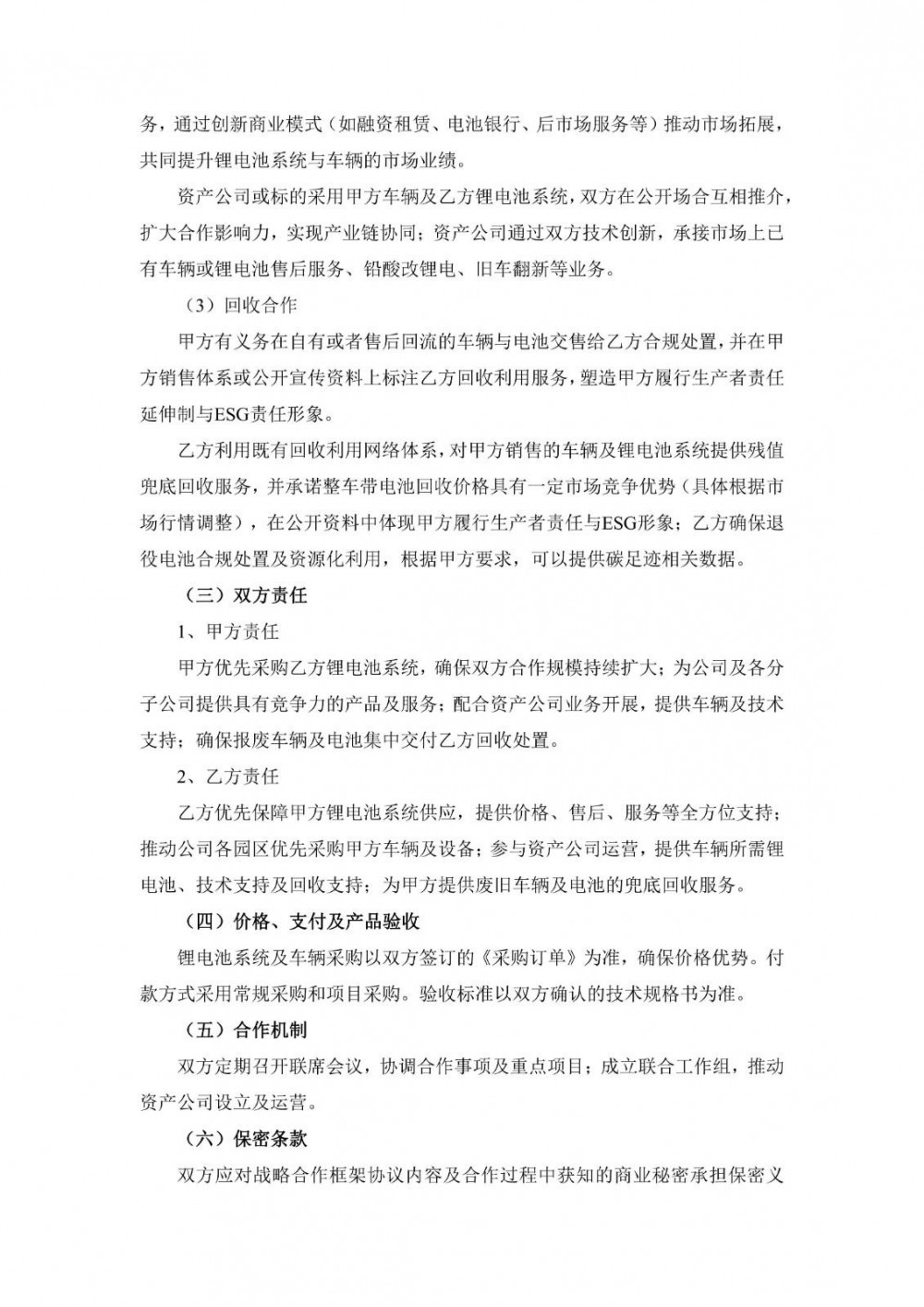 双方在中国及海外新能源市场,围绕电动观光车、高尔夫球车、清扫车等场地车辆及锂电池项目开展全面合作,包括但不限于锂电系统开发与供应,电池系统配套与车辆采购,运营资产持有与推广,废旧车辆与锂电池回收,碳足迹,ESG品牌联合推广等。