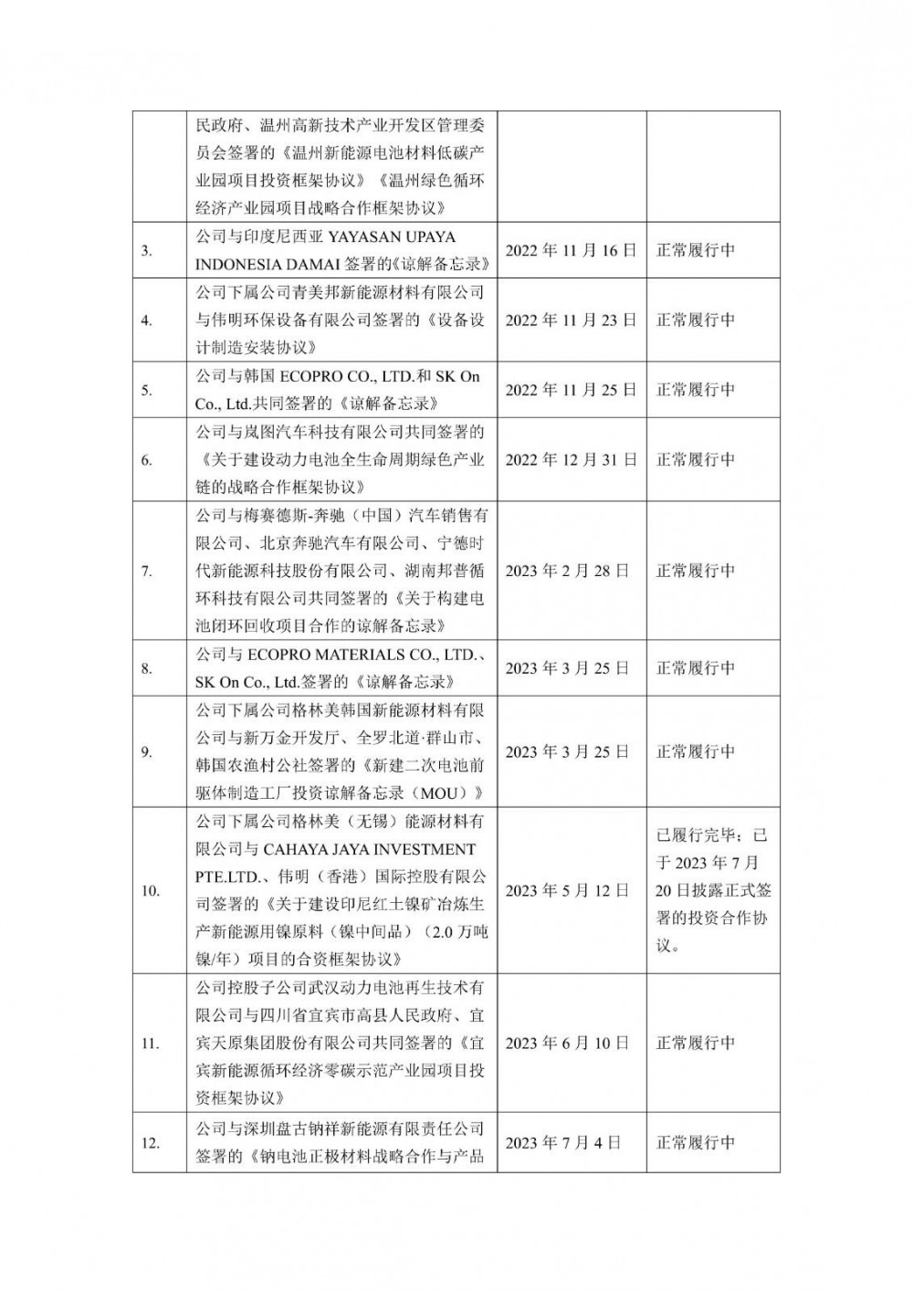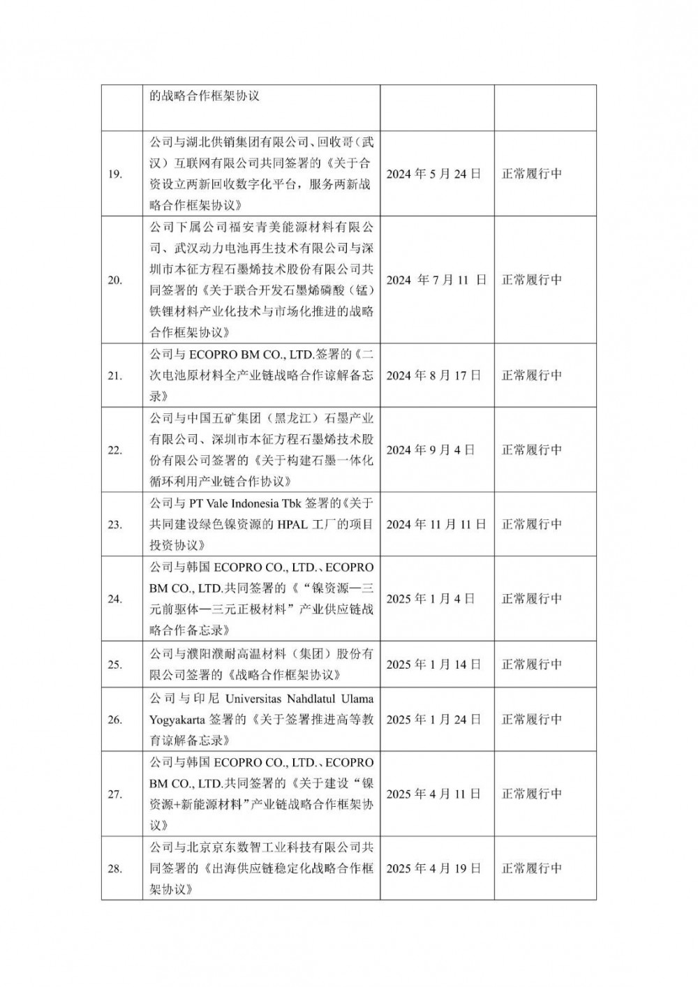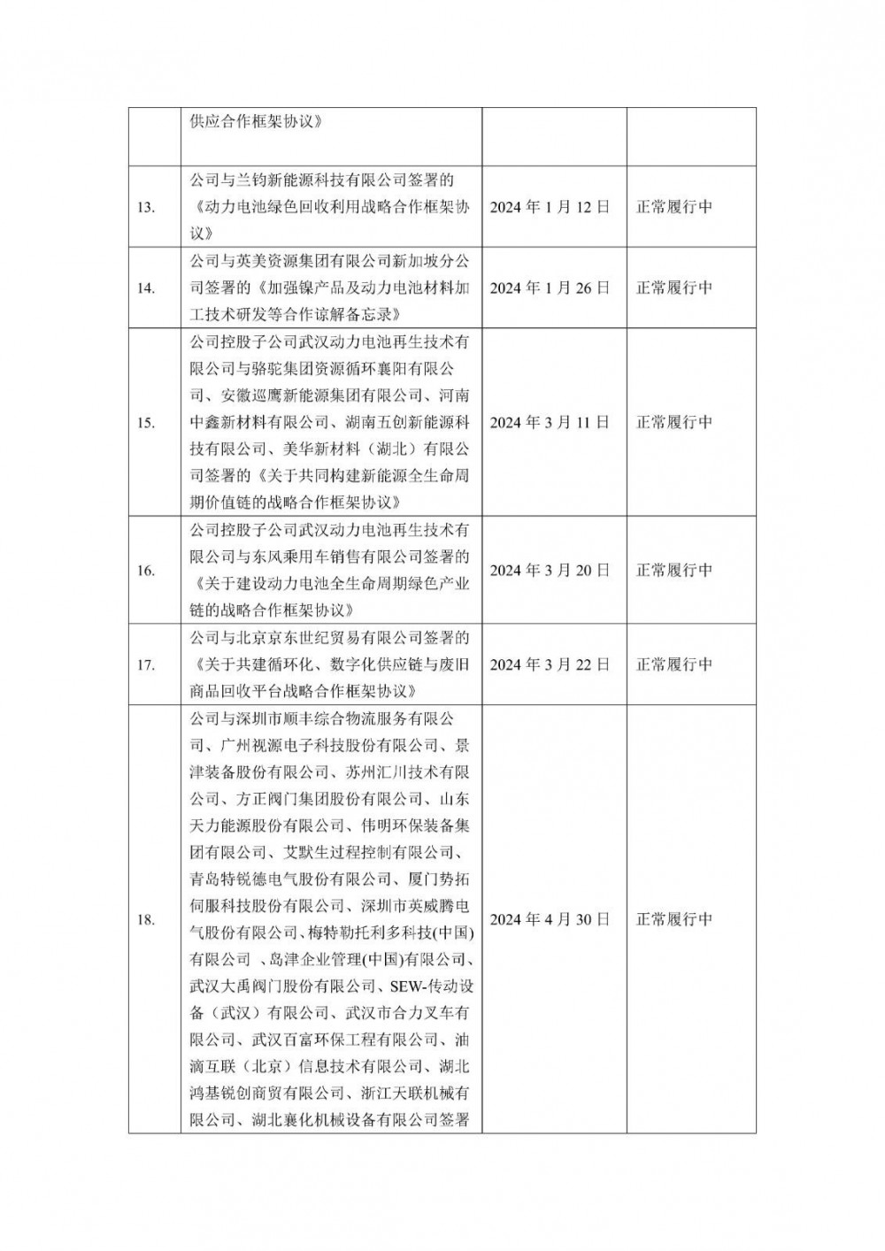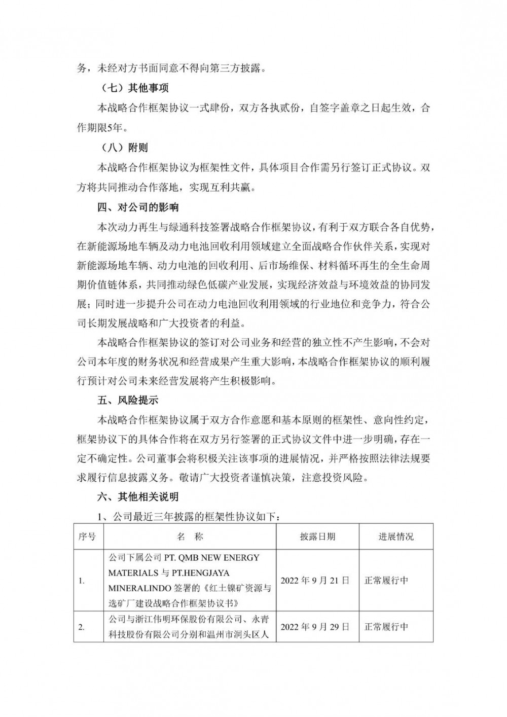 格林美表示,本次动力再生与绿通科技签署战略合作框架协议,有利于双方联合各自优势,在新能源场地车辆及动力电池回收利用领域建立全面战略合作伙伴关系,实现对新能源场地车辆、动力电池的回收利用、后市场维保、材料循环再生的全生命周期价值链体系,共同推动绿色低碳产业发展,实现经济效益与环境效益的协同发展;同时进一步提升公司在动力电池回收利用领域的行业地位和竞争力,符合公司长期发展战略和广大投资者的利益。