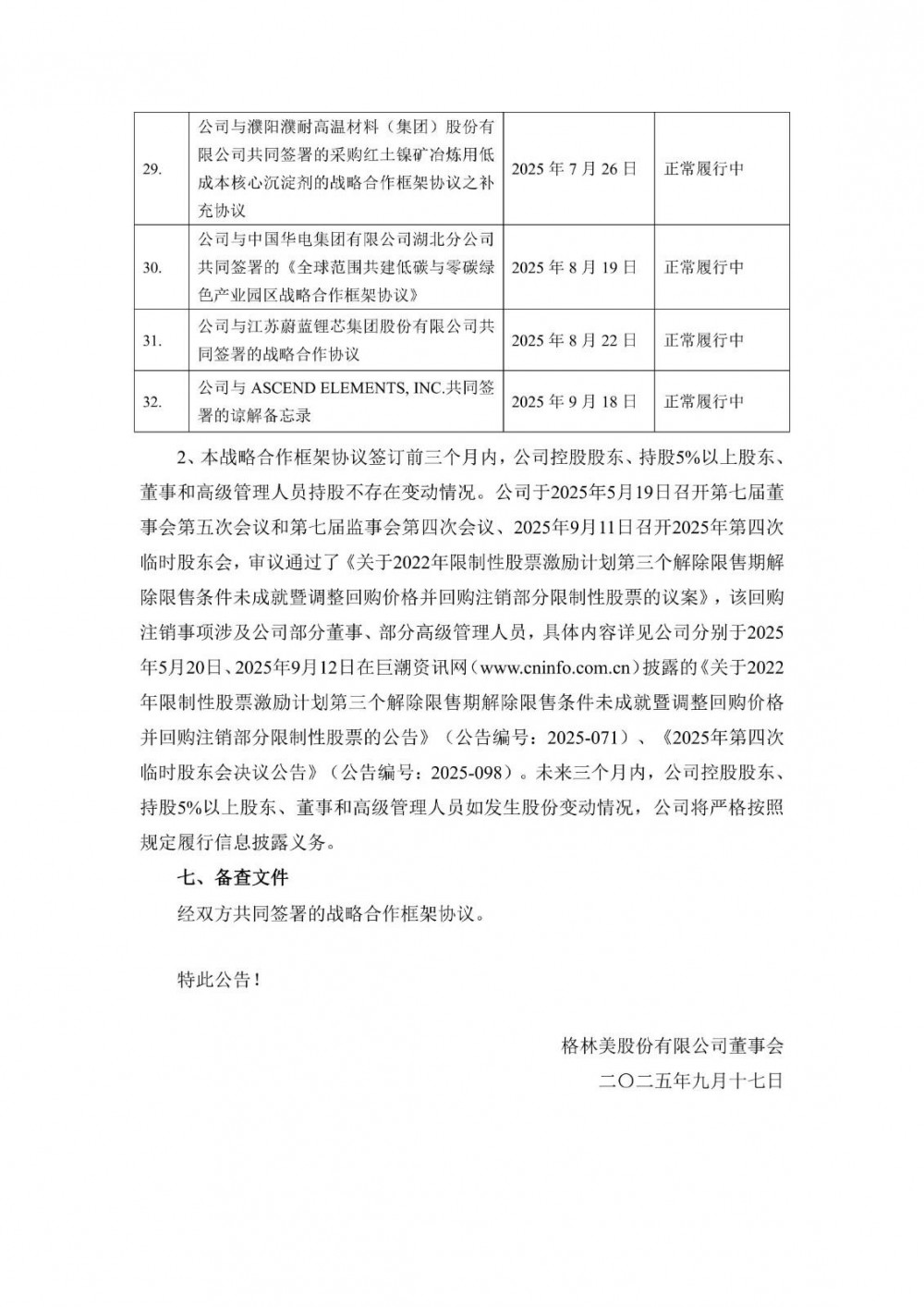 9月17日,格林美发布公告称,公司控股子公司武汉动力电池再生技术有限公司与广东绿通新能源电动车科技股份有限公司于2025年9月17日共同签署了战略合作框架协议,双方决定联合优势,在新能源场地车辆及动力电池回收利用领域建立全面战略合作伙伴关系,实现对新能源场地车辆、动力电池的回收利用、后市场维保、材料循环再生的全生命周期价值链体系,打造“新能源车回收—动力电池回收—电池原料再造—电池材料再造—动力电池再造”闭环产业链,共同推动绿色低碳产业发展,提升全球市场竞争力,实现经济效益与环境效益的协同发展。