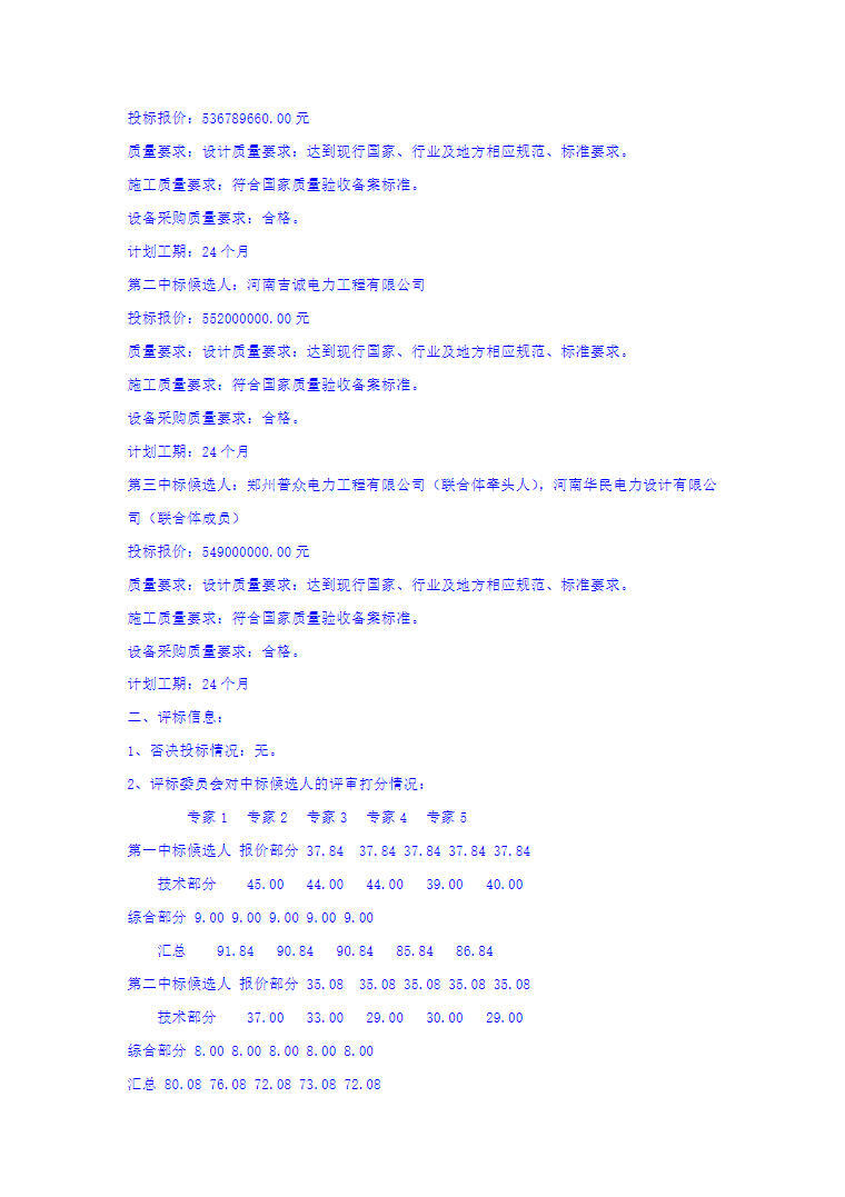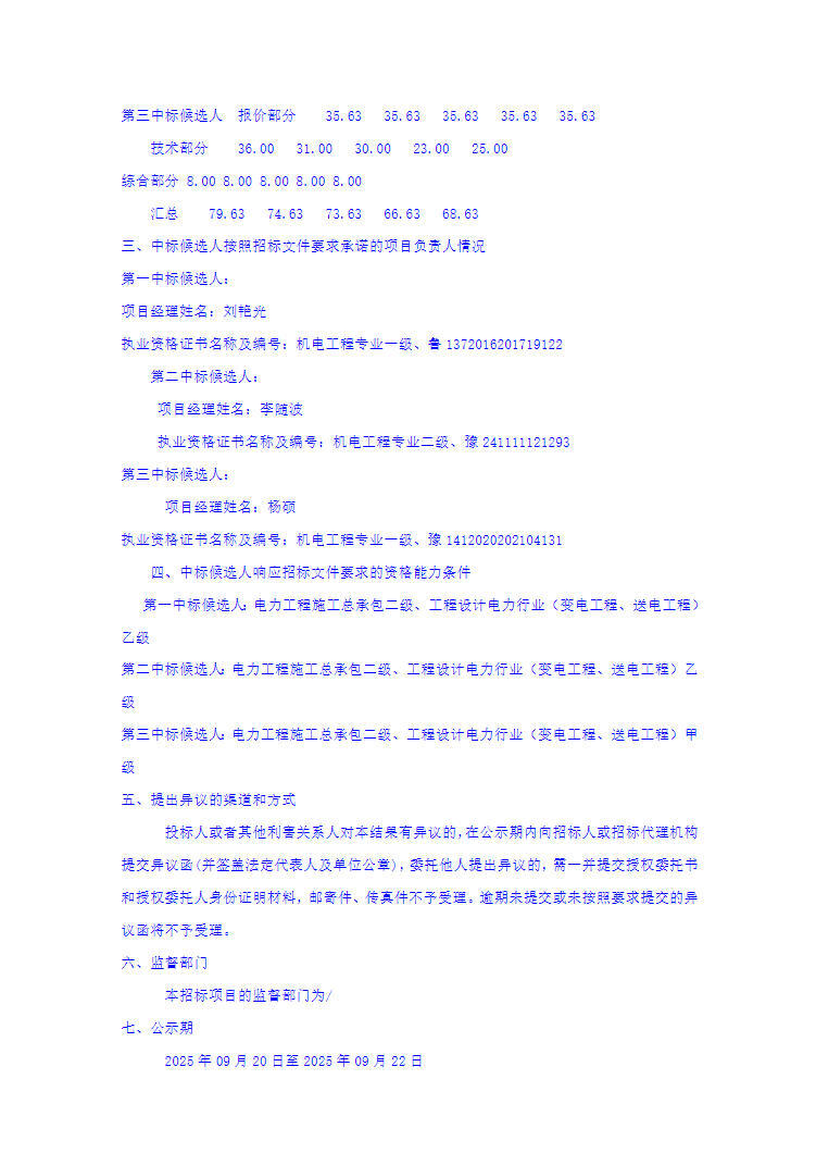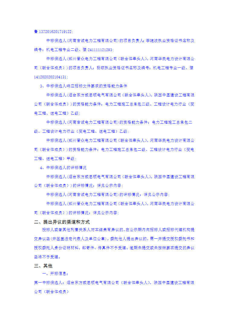 第一中标候选人为烟台东方威思顿电气有限公司、陕西中圆建设工程有限公司联合体,投标报价53678.966万元,折合单价1.342元/Wh;第二中标候选人为河南吉诚电力工程有限公司,投标报价55200万元,折合单价1.380元/Wh;第三中标候选人为郑州普众电力工程有限公司、河南华民电力设计有限公司联合体,投标报价54900万元,折合单价1.373元/Wh。