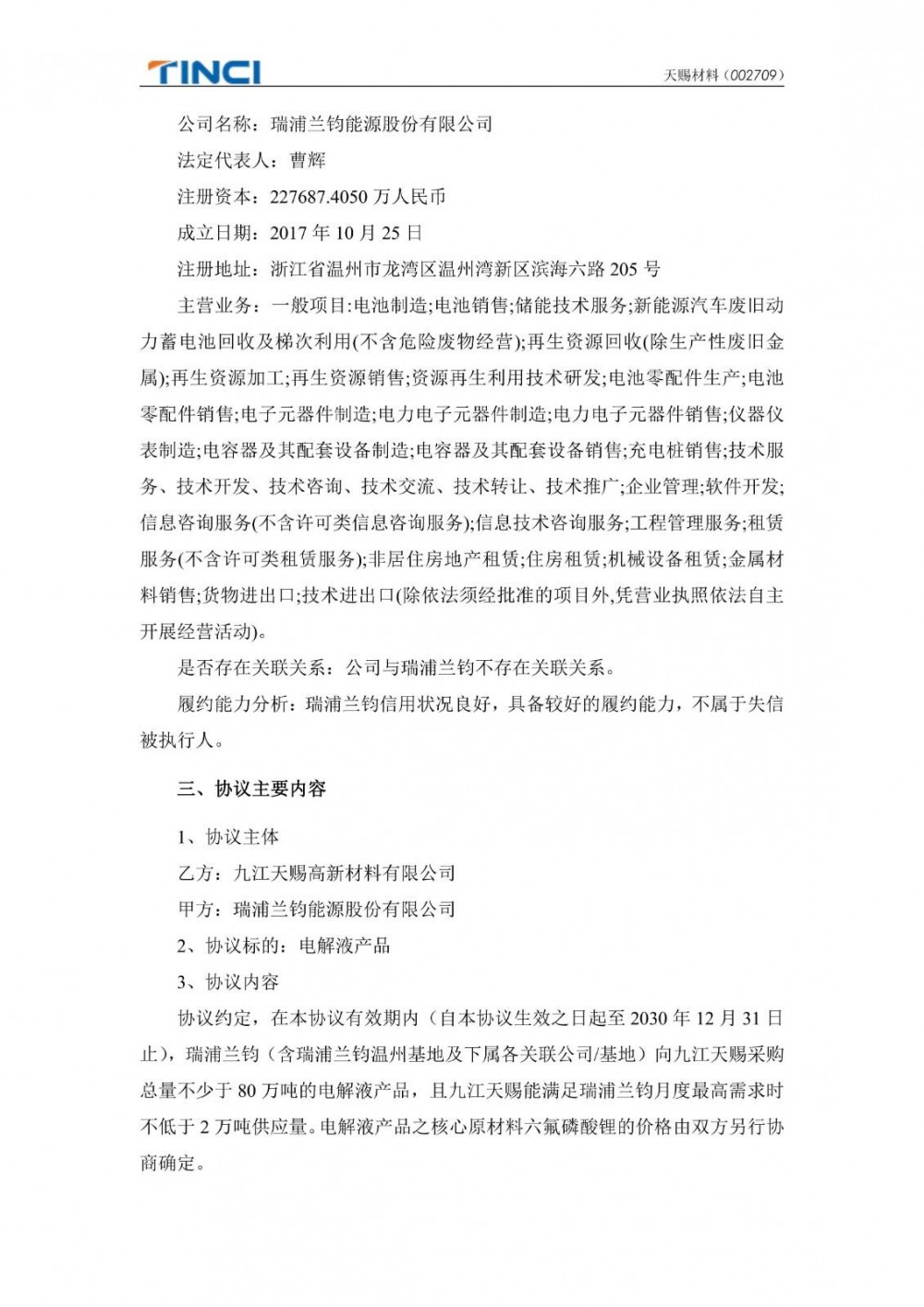 近日,天赐材料发布公告称,公司全资子公司九江天赐高新材料有限公司与瑞浦兰钧能源股份有限公司签订了《合作协议》。协议约定,在本协议有效期内(自本协议生效之日起至2030年12月31日止),瑞浦兰钧(含瑞浦兰钧温州基地及下属各关联公司/基地)向九江天赐采购总量不少于80万吨的电解液产品。货物的具体采购量、采购单价、规格型号等以经双方确认的《采购订单》为准。