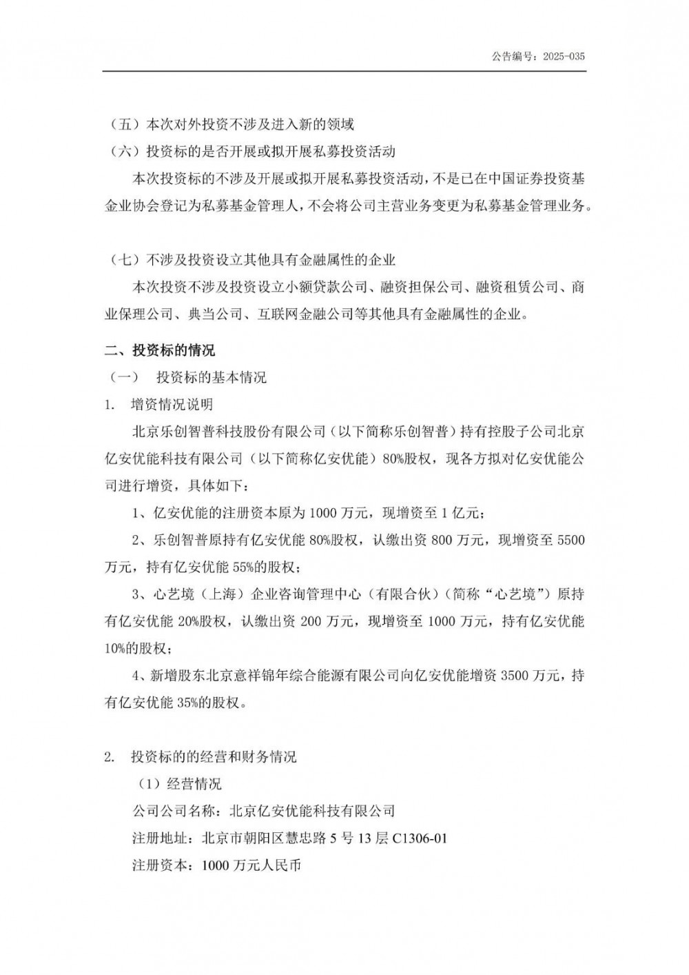 9月23日,乐创智普公告,公司拟以自有资金人民币4700万元对控股子公司北京亿安优能科技有限公司增资,心艺境(上海)企业咨询管理中心(有限合伙)拟以自有资金人民币800万元对亿安优能增资,北京意祥锦年综合能源有限公司拟以自有资金人民币3500万元对亿安优能增资。本次增资完成后,亿安优能注册资本由人民币1,000万元增加为人民币1亿元,公司持有亿安优能55%股权,心艺境(上海)企业咨询管理中心(有限合伙)持有亿安优能10%股权,北京意祥锦年综合能源有限公司持有亿安优能35%股权。